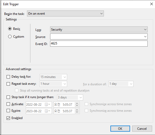 다음으로 Trigger Tab으로 이동해 Begin the task에 'On an event'를 선택하고 Log에는 Security를 Event ID로는 4625를 입력합니다.