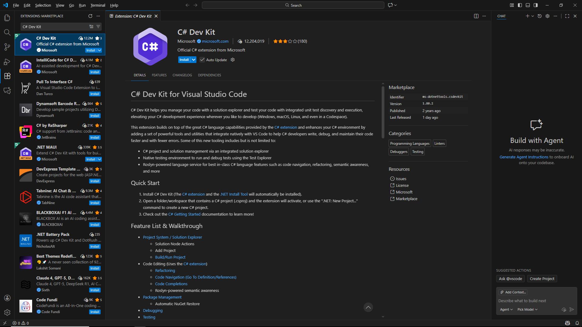 | C# (ms-dotnettools.csharp) | C#에 특화된 기능을 제공하기 위한 것으로 IntalliSense와 code탐색, debugging기능 지원등을 통해 더 빠르고 안정적인 C#개발경험을 제공합니다. 'C# Dev Kit'을 설치했다면 해당 확장기능은 따로 설치할 필요 없습니다. |