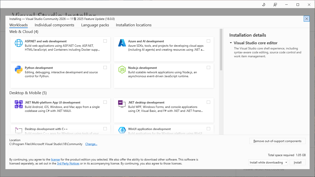 Visual Studio중에서 가장 최신의 version은 2025년 11월 출시한 Visual Studio 2026(이하 VS2026)이며 .NET10을 공식적으로 지원하는 유일한 개발도구이기도 합니다. Visual Studio는 Professional, Enterprise와 같이 여러 version이 존재하는데 2014년 10월부터 학생이나 open source 기여자, 개인에 한해 무료로 제공되고 있는 Community Edition도 존재합니다. Community는 Professional과 거의 비슷한 기능을 제공하면서도 무료로 배포되고 있으므로 학습을 위한 목적으로 가장 알맞은 Visual Studio version이라 할 수 있습니다. 향후 예제를 만드는 경우에도 Community Edition을 사용할 것이며 그중에서 가장 최신 version인 Visual Studio 2026를 사용할 것입니다.