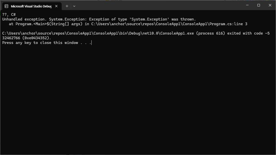그리고 VS2026의 Debug -> Start Without Debugging를 선택해 Project를 실행합니다. 이때 Debugging으로 Project를 시작하지 않도록 주의해야 합니다. 예외가 발생하면 Debugger에 의해 예외가 다뤄지기 때문에 보려고 하는 결과를 제대로 살펴볼 수 없습니다.