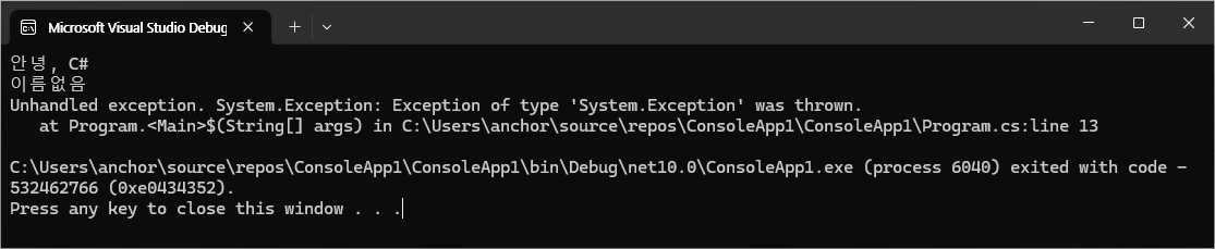 Project의 Program.cs에서 다음과 같이 예외를 일으키는 구문을 추가합니다.