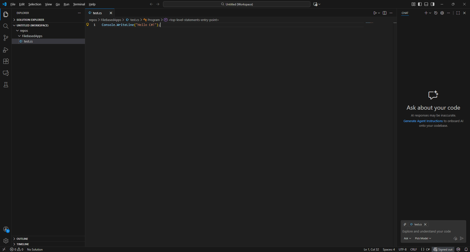 우선 알아둬야 할 건 File-based app은 dotnet CLI 기능이므로 VS2026에서 만들 수 없다는 것입니다. 따라서 적당한 folder를 하나 만들고 여기서 VSCode와 같은 Code편집기로 임의의 cs file을 하나 생성한 뒤 필요한 file내용을 직접 작성합니다. 예제에서는 FileBasedApps folder에 test.cs라는 file을 만들어보았습니다.