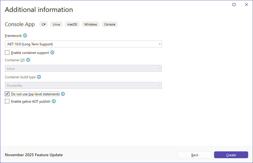 사실 top-level programs라는 기능은 .NET 5부터 도입된 것인데 이걸 Microsoft는 .NET 6에 와서야 Console App project의 template에 기본으로 적용하도록 하였으며 .NET 7부터 개발자의 선호도에 따라 직접 어떤 style로 시작할지 선택할 수 있도록 하였습니다. 따라서 top-level programs기능을 사용하고 싶지 않다면 VS2026의 경우 Project생성 시 'Do net use top-level statements'를 선택하면 되고 dotnet CLI를 사용하는 경우 '--use-program-main'이라는 option을 붙여주면 됩니다.