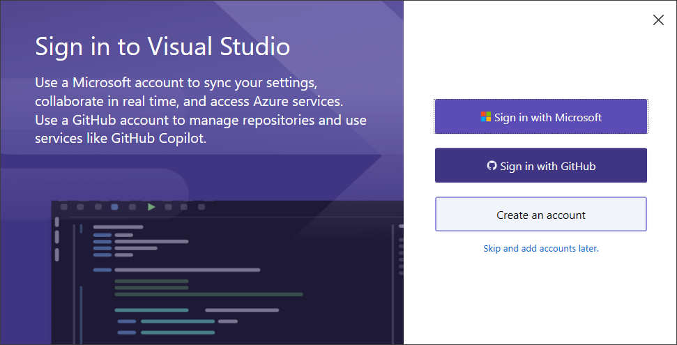 만약 Microsoft계정이 있다면 해당 계정을 통해 login하면 되고 없다면 새로운 계정을 생성할 수 있습니다.(굳이 login을 하지 않더라도 하단의 'Skip and add accounts later.'를 선택하면 별도의 login 없이 VS2026을 사용할 수는 있으나 기능의 완전한 사용을 위해 login을 권장합니다.)