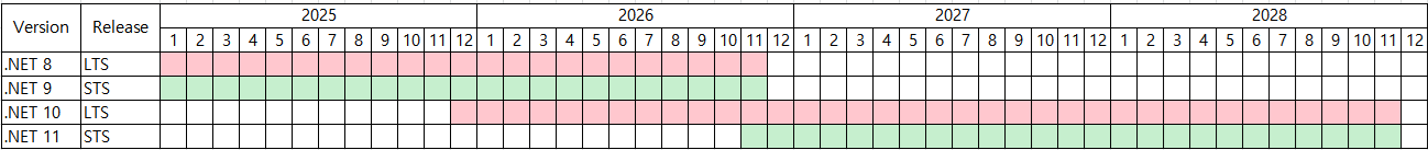 .NET의 생명주기와 관련된 version은 크게 3가지로 나누어 볼 수 있습니다. 하나는 LTS(Long-Term Support)이고 다른 하나는 STS(Standard-Term Support)이며 나머지 하나는 Preview입니다. 그리고 이들 각각은 아래와 같은 지원가능한 주기를 갖고 있습니다.