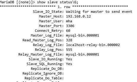 change master to master_host='192.168.0.12', master_user='mha', master_password='!mha123',