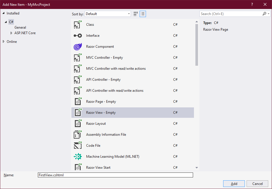 추가할 View의 이름을 FirstView.cshtml로 지정한뒤 'Add'를 누르면