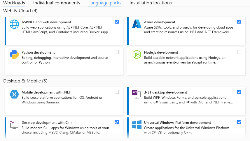 파일을 다운로드하고 실행하면 잠시 후 아래와 같은 일련의 설치 옵션이 표시될 것입니다. 이 상태에서 ASP.NET Core개발을 위해 'ASP.NET and web development'를 체크합니다.