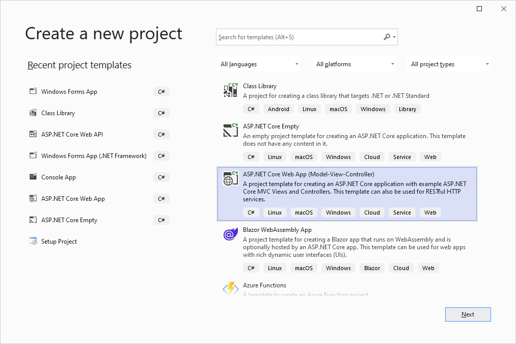 참고로 Visual Studio는 ASP.NET Core개발시 사용되는 여러 타입의 파일들을 구조적으로 생성하기 위한 기능을 제공하고 있으므로 .NET개발이 처음이라면 Visual Studio를 사용하는 것이 ASP.NET Core의 전반적인 개발 구조를 이해하는데 도움이 될 수 있습니다.