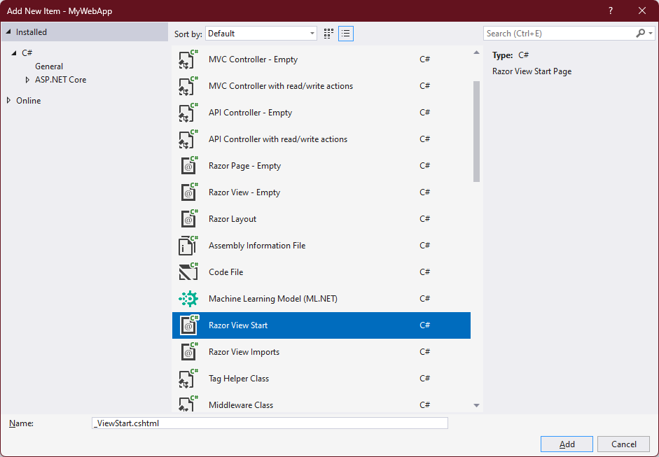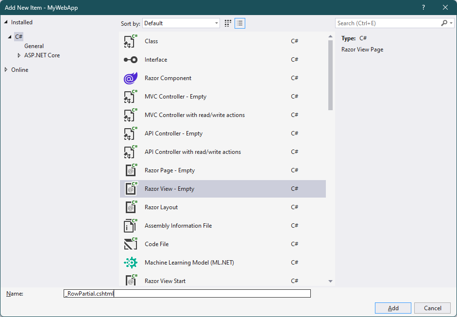 사실 Partial View는 일반적인 cshtml인데 일반적인 다른 View와 구별되는 차이점은 이들이 사용되는 방식입니다. Partial View는 Visual Studio의 'Add New Item'에서 'Razor View' Template을 선택한 뒤 생성할 file명을 지정함으로써 추가할 수 있습니다.