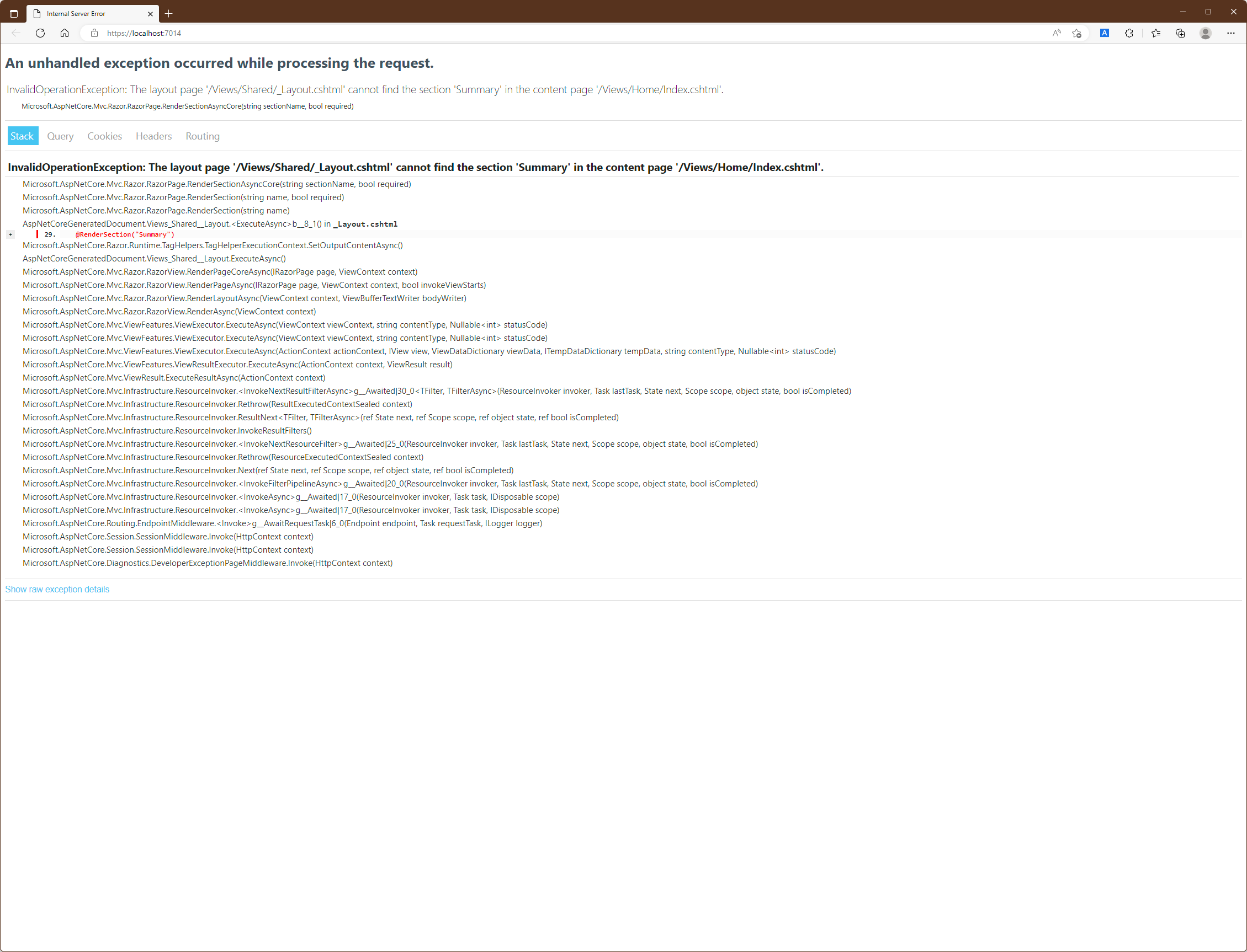 기본적으로 View는 Layout에 RenderSection호출이 있는 모든 Section을 포함해야 하며 Layout에서 View가 정의하지 않은 Section을 요구하게 되면 예외를 발생시키게 됩니다. 아래 예제에서는 Views/Shared의 _Layout.cshtml을 수정하여 Summary라는 Section이 필요한 RenderSection method를 추가하였습니다.