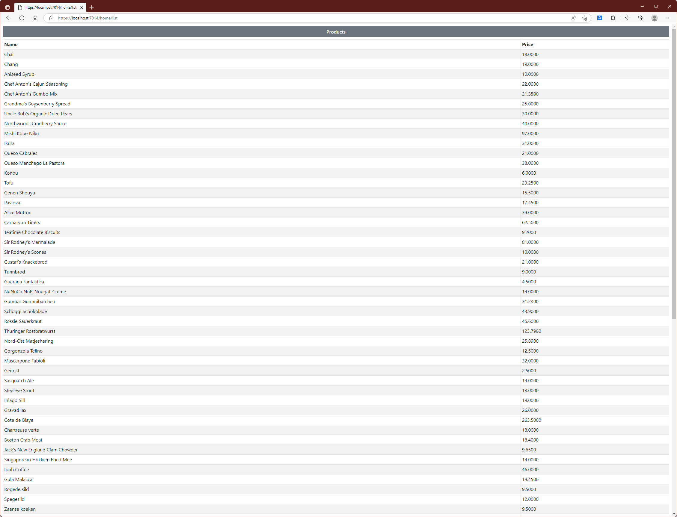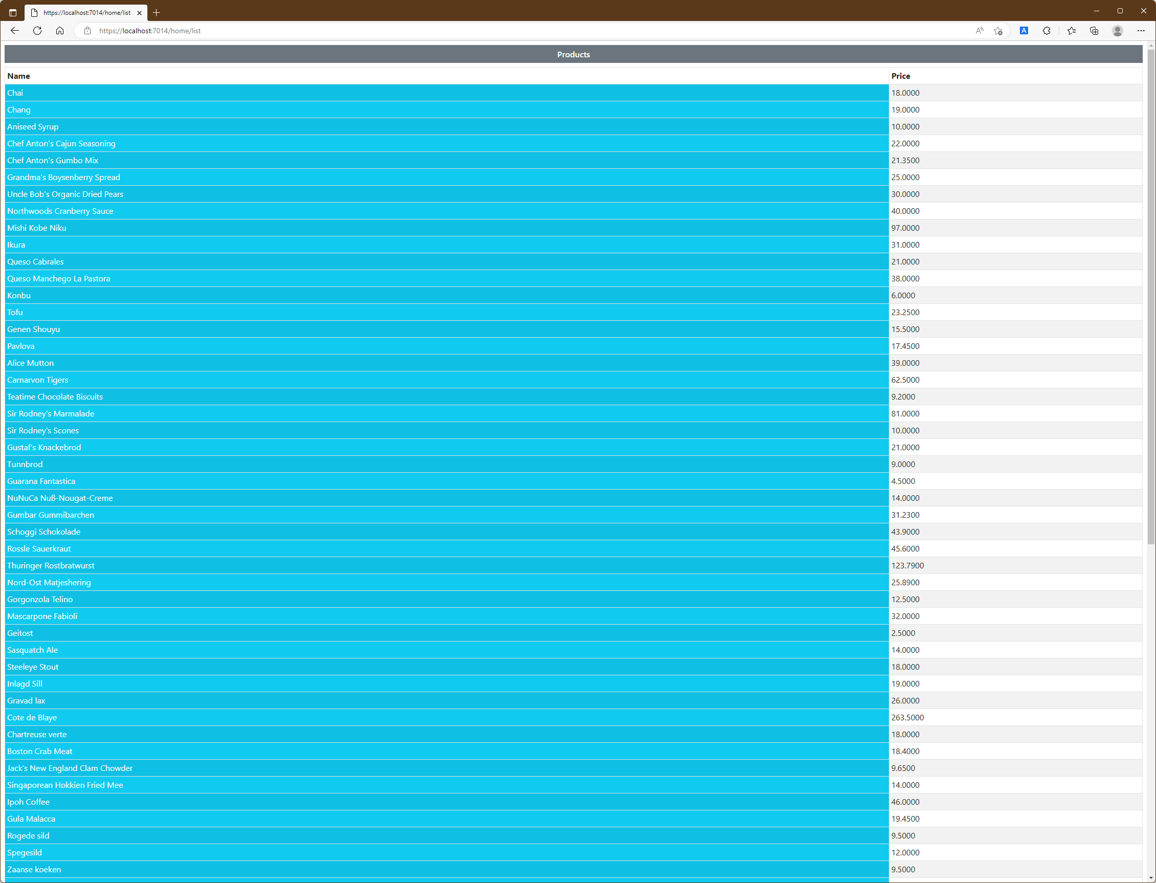예제에서 사용된 parital요소에서는 name을 통해 '_RowPartial'View를 선택하고 있으며 model속성에서는 사용될 View Model 개체로 Products개체를 전달하고 있습니다. partial요소에서는 @foreach 표현식 안에서 적용되고 있으므로 table의 각 row를 생성하는 데 사용될 수 있는 것입니다. 따라서 Project를 실행한 후 /home/list로 URL을 요청하면 아래와 같은 응답이 생성됩니다.
