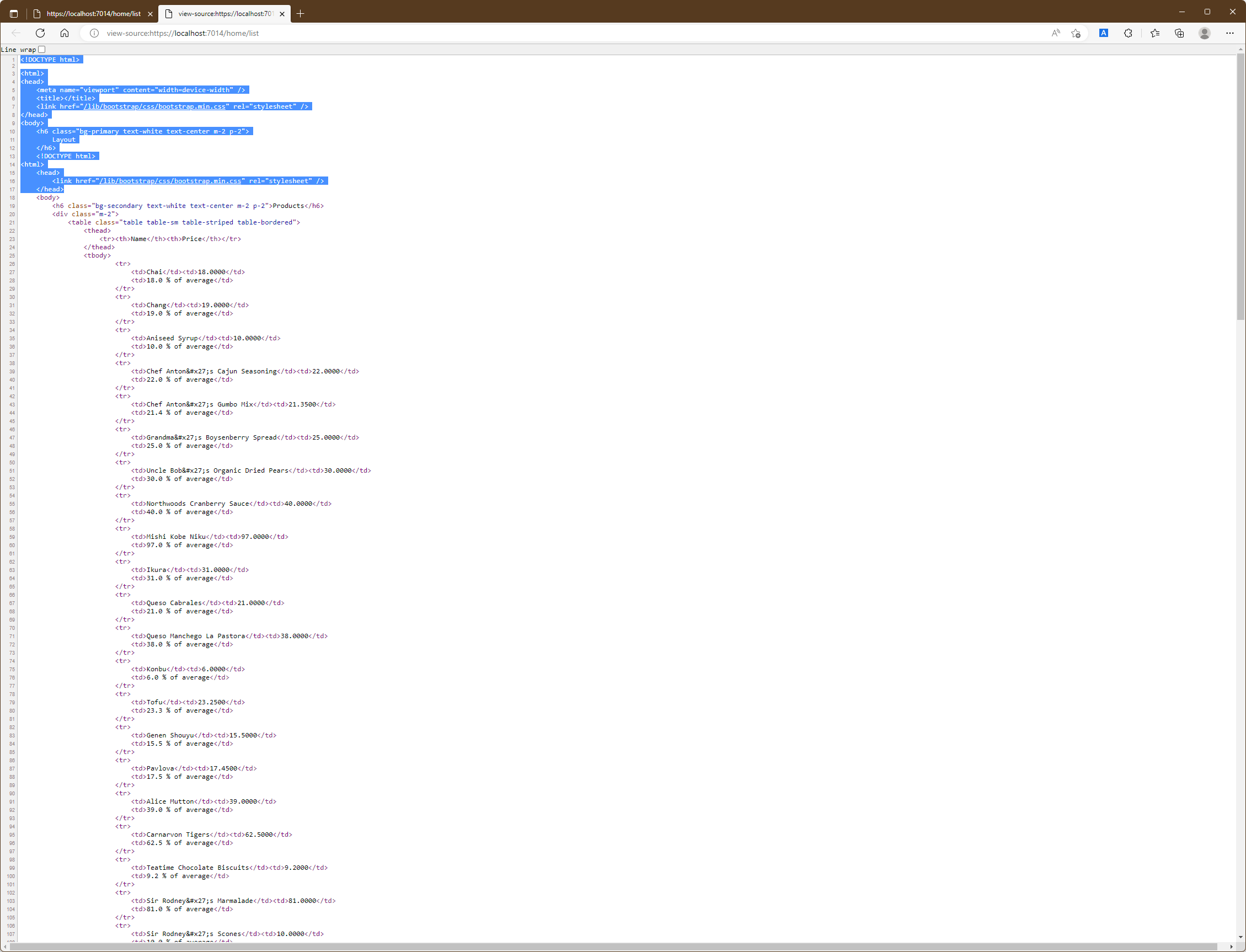 이때 model표현식은 해당 Partial view에서 사용할 view model유형을 정의하는 데 사용되었으며 일반적인 다른 View처럼 HTML 요소와 표현식이 결합된 content를 가질 수 있습니다. 해당 content는 table요소에서 row를 생성하며 해당 cell을 채우기 위해 Products개체의 ProductName과 UnitPrice속성을 사용하고 있습니다.