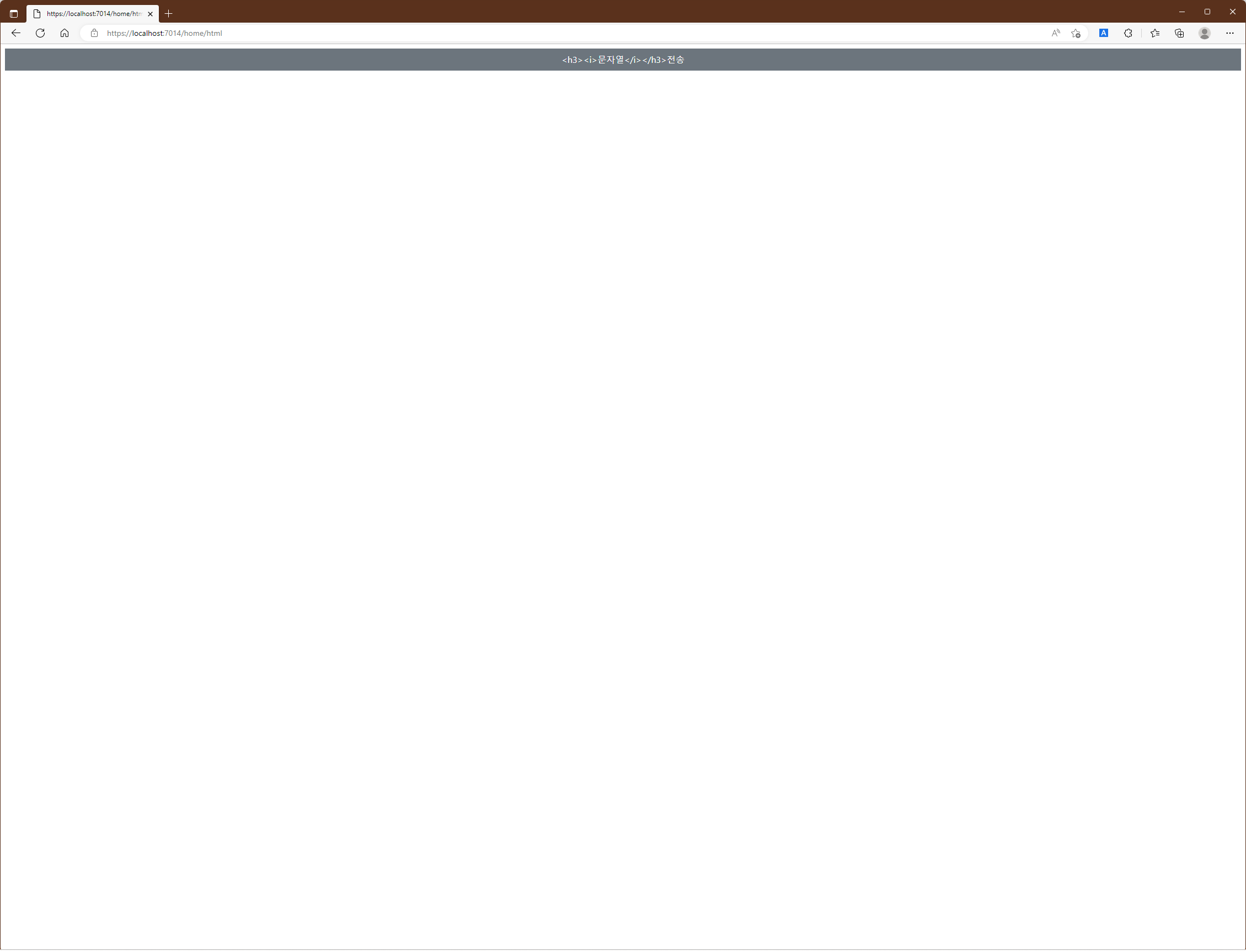 위와 같이 file을 저장하고 Project를 실행한 뒤 위와 동일한 URL을 요청하면 View model 문자열이 Encoding 없이 전달되었고 Browser에 의해 HTML 문서의 일부로 변환되었음을 알 수 있습니다.