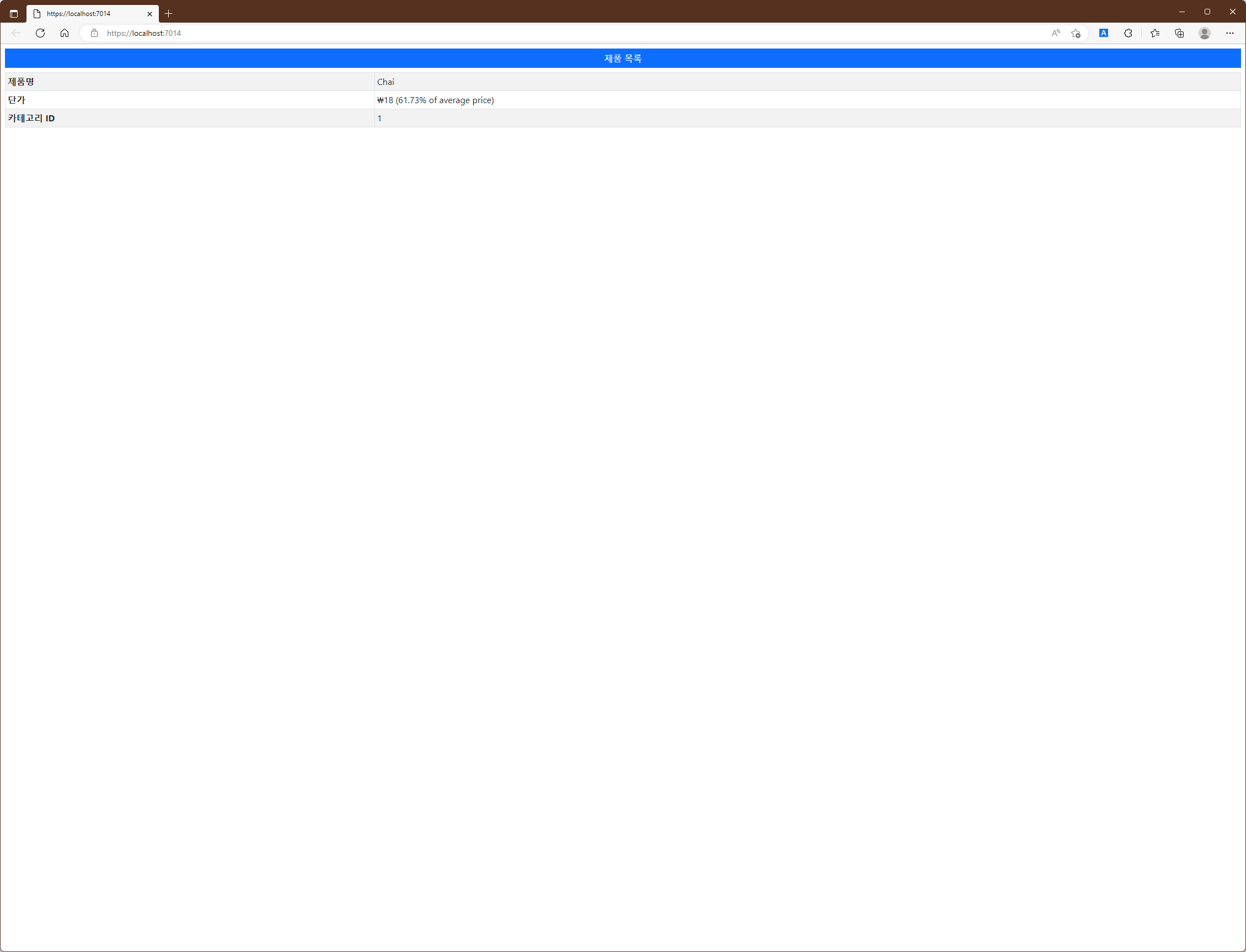 예제에서 사용된 parital요소에서는 name을 통해 '_RowPartial'View를 선택하고 있으며 model속성에서는 사용될 View Model 개체로 Products개체를 전달하고 있습니다. partial요소에서는 @foreach 표현식 안에서 적용되고 있으므로 table의 각 row를 생성하는 데 사용될 수 있는 것입니다. 따라서 Project를 실행한 후 /home/list로 URL을 요청하면 아래와 같은 응답이 생성됩니다.