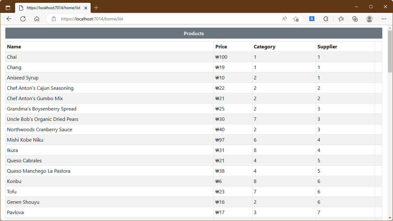 위 결과에서 select요소를 확인해 보면 각 href attribute가 Product개체의 ProductId값을 다음과 같이 포함한다는 것을 알 수 있습니다.