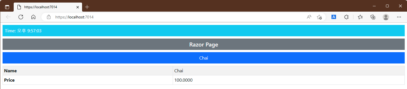 Project를 실행하여 /home으로 URL을 요청하고 다음과 같은 결과를 확인합니다. theme요소의 값은 tag helper에서 다른 tag helper로 전달되었고 color theme는 변환되는 각 요소에서 attribute를 정의하는 것 없이 적용되었습니다.