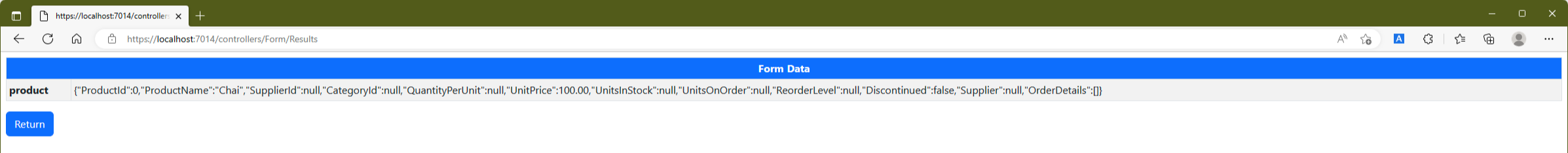 model binding system은 ASP.NET Core가 SubmitForm action method에서 처리될 요청을 받을때 ProductName과 UnitPrice값을 가져오기 위해 사용됩니다. 매개변수의 사용은 action method를 단순화하며 또한 요청 data를 C# data로 변환하는 역할을 수행함으로써 price값은 C#의 action method가 호출되기 전에 decimal type으로 변환될 것입니다.(예제에서는 decimal을 temp data로 저장하기 위해 다시 string로 변환하였습니다.) project를 실행하여 /controllers/form URL을 요청한 뒤 submit button을 click 합니다. 그러면 model binding기능에 의해 요청으로부터 값이 다음과 같이 추출될 것입니다.