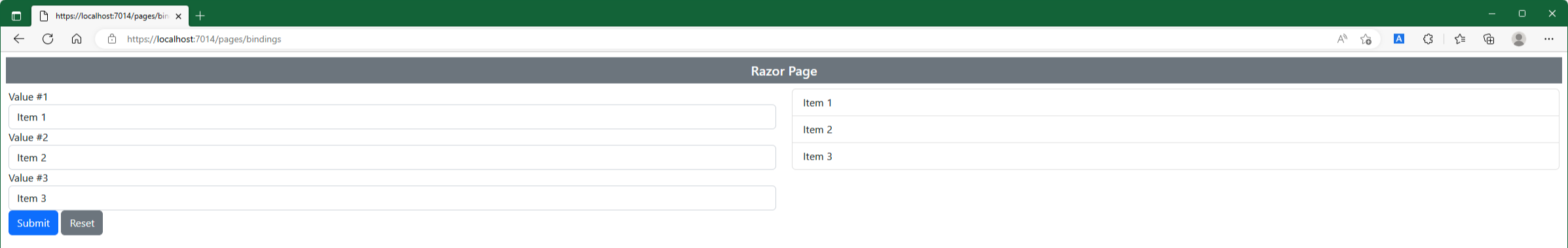 예제에서 Data속성의 type은 SortedSet<string>으로 변경되었습니다. 이에 따라 model binder는 alphabet순으로 정렬될 input요소로 부터의 값을 채우게 될 것입니다. cshtml에서는 여전히 input요소의 name attribute에 index표시가 남아 있기는 하지만 collection class는 alphabet순서로 값을 정렬할 것이기 때문에 큰 의미는 없습니다. project를 실행하고 /pages/bindings URL을 요청한 뒤 field를 채우고 form을 submit 합니다. model binding process는 정렬된 form값을 채우게 되고 다음과 같은 순서로 표현될 것입니다.