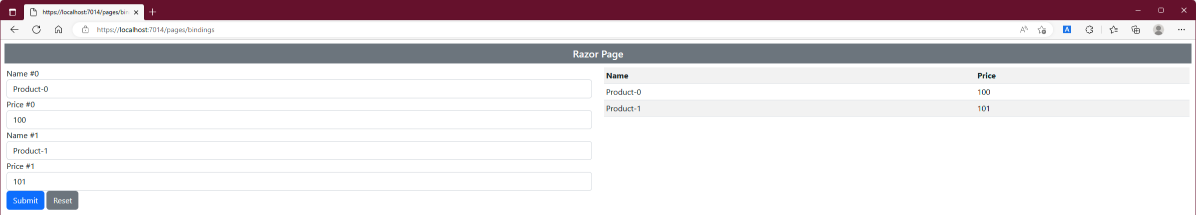 Data속성에 대한 model binding process는 사용자가 예제의 form에 추가된 checkbox를 check 한 경우에만 수행됩니다. 따라서 checkbox가 check 되어 있지 않다면 어떠한 model binding도 처리되지 않으며 form data는 무시됩니다. model binding이 사용된다는 것을 분명히 알아보기 위해 form이 render 될 때 UnitPrice의 값이 증가되도록 하였습니다. project를 실행하고 /pages/bindings URL을 요청한 뒤 checkbox를 check 하고 form을 submit 하면 다음과 같은 결과를 볼 수 있습니다.