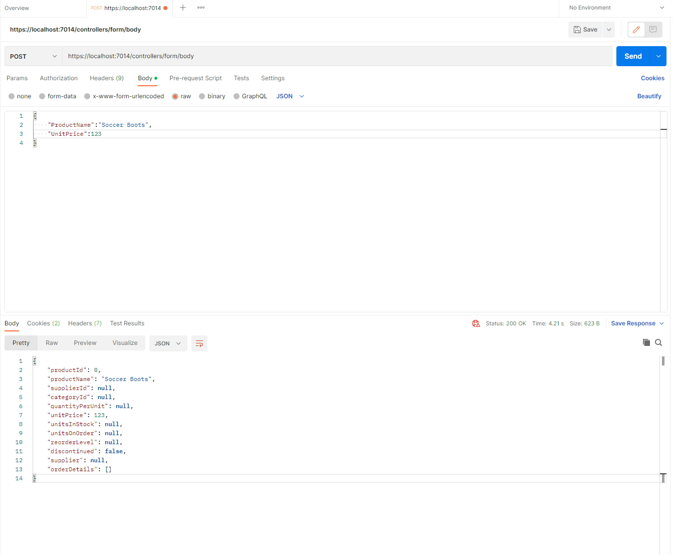 project를 실행한 뒤 POSTMAN을 열어 URL을 /controllers/form/body로 설정하고 JSON형식으로 ProductName과 UnitPirce를 전송하면 다음과 같은 결과를 볼 수 있을 것입니다.
