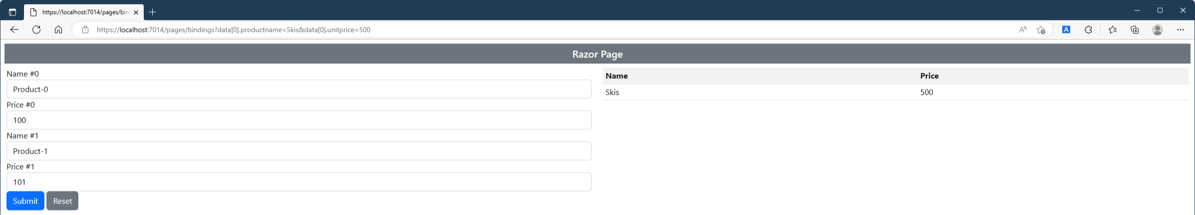 FromQuery attribute는 query string을 통해 model binder값의 source로서 사용하도록 함으로써 Products array를 생성하게 됩니다. project를 실행하여 /pages/bindings?data[0].productname=Skis&data[0].unitprice=500 으로 URL을 호출하면 다음과 같은 결과를 볼 수 있을 것입니다.