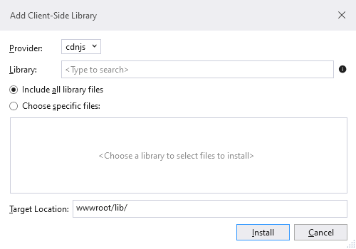 Visual Studio에서 Solution Explorer에 있는 Project를 선택하고 Mouse 오른쪽 button으로 click한뒤 Add->Client-Side Library를 차례로 선택하면 다음과 같은 화면을 볼 수 있습니다. 이 화면을 통해 package가 repository에 위치시키고 설치할 수 있습니다.