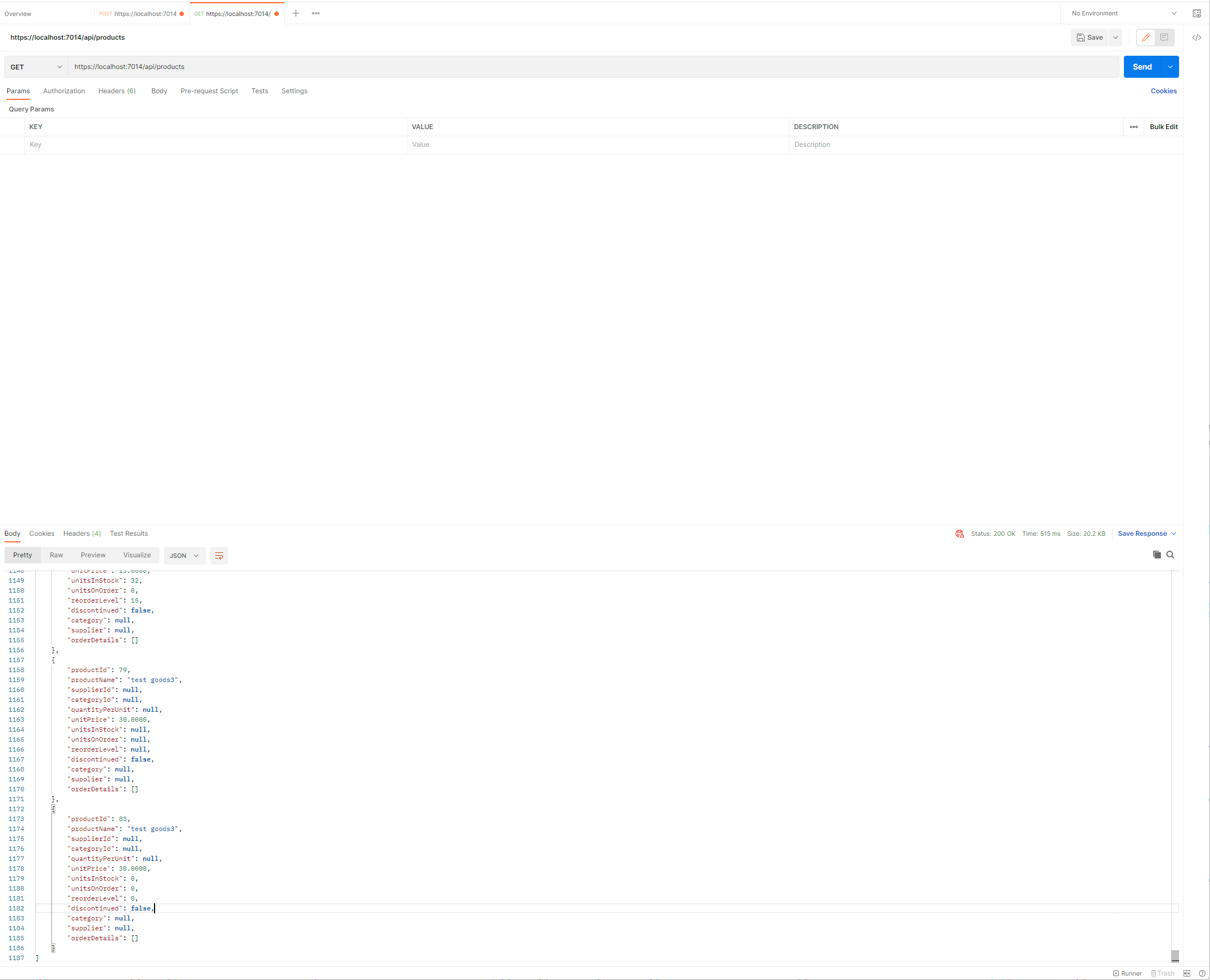 예제에서의 설정은 모든 JSON 응답에 영향을 주게 될 것이며 주의 깊게 사용되어야 합니다. 특히, Data Model Class가 null값을 사용하는데 이러한 속성 자체가 client에게 중요한 정보로 취급될 수 있는 경우에는 더 그렇습니다. 해당 설정이 어떻게 적용되는지를 알아보기 위해 이번에는 postman을 통해 /api/products URL로 GET 요청을 수행합니다.