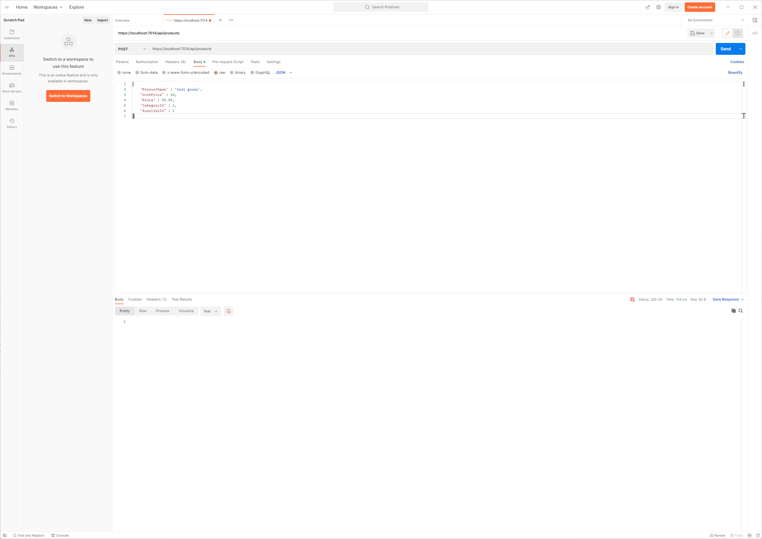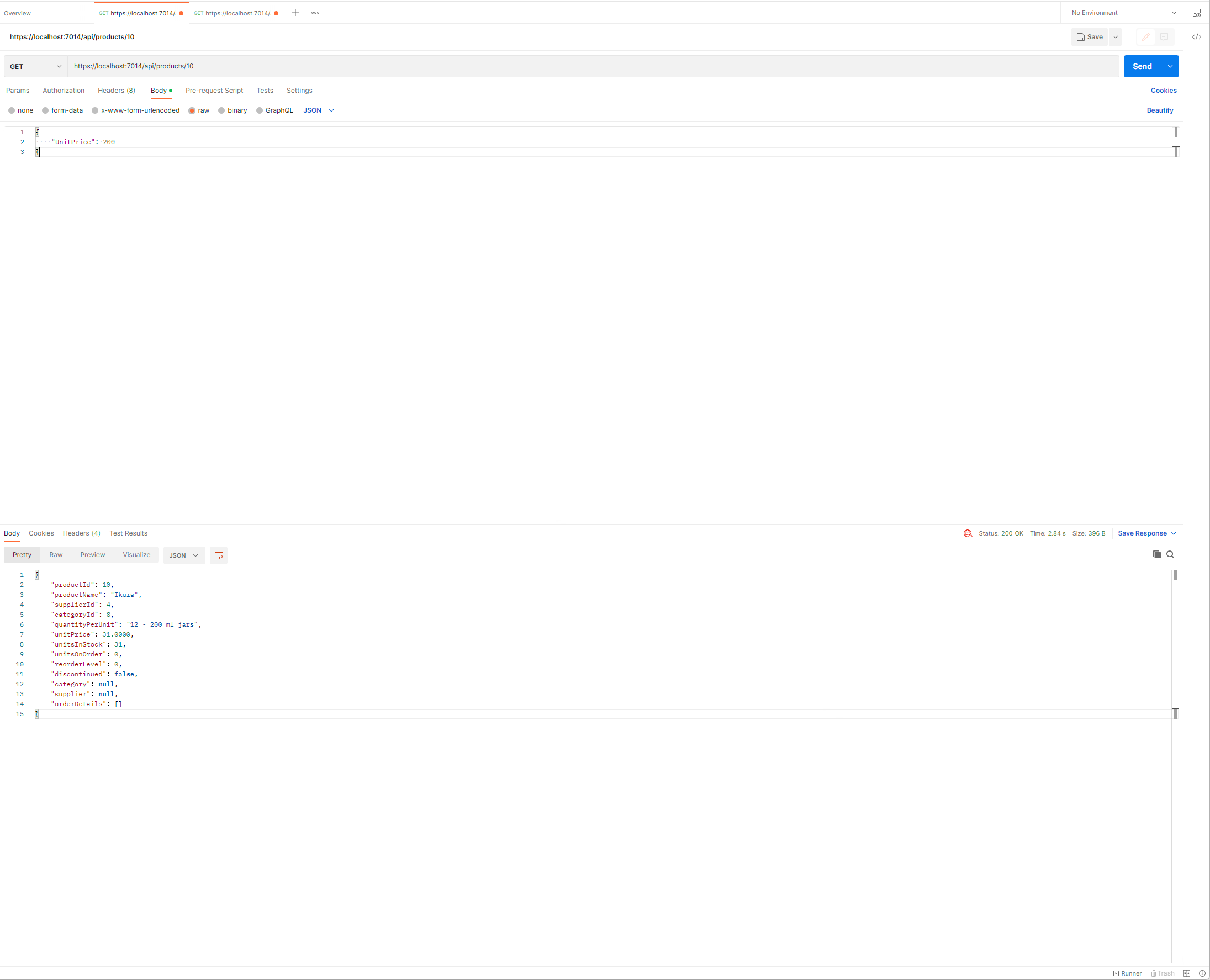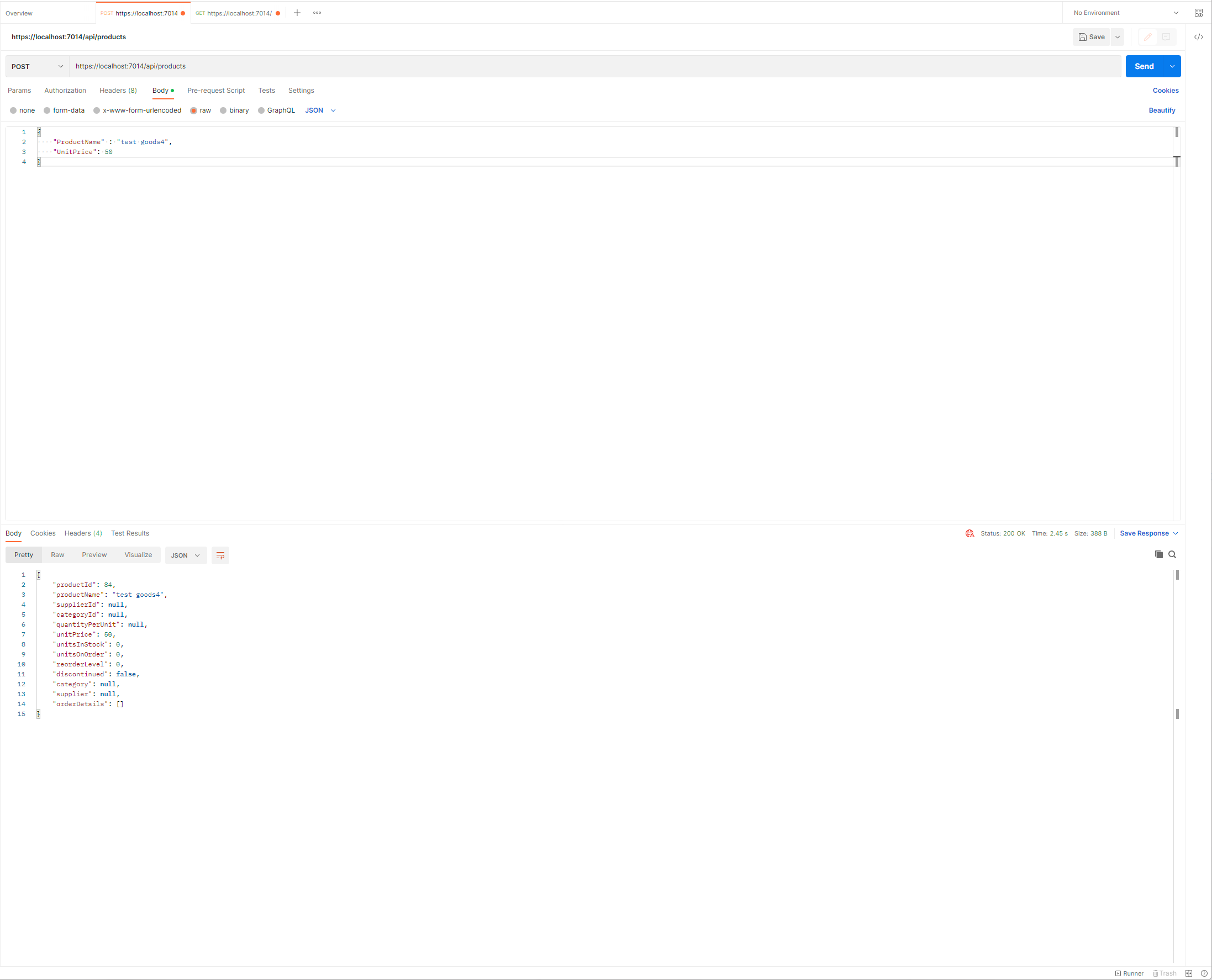 POST 요청에서는 요청의 Body가 JSON형식이며 Product 개체로 생성되고 Database에 추가되기 위해 Parsing이 이루어질 것입니다. 보내지는 JSON개체는 보시는 바와 같이 ProductName, UnitPrice, Price,