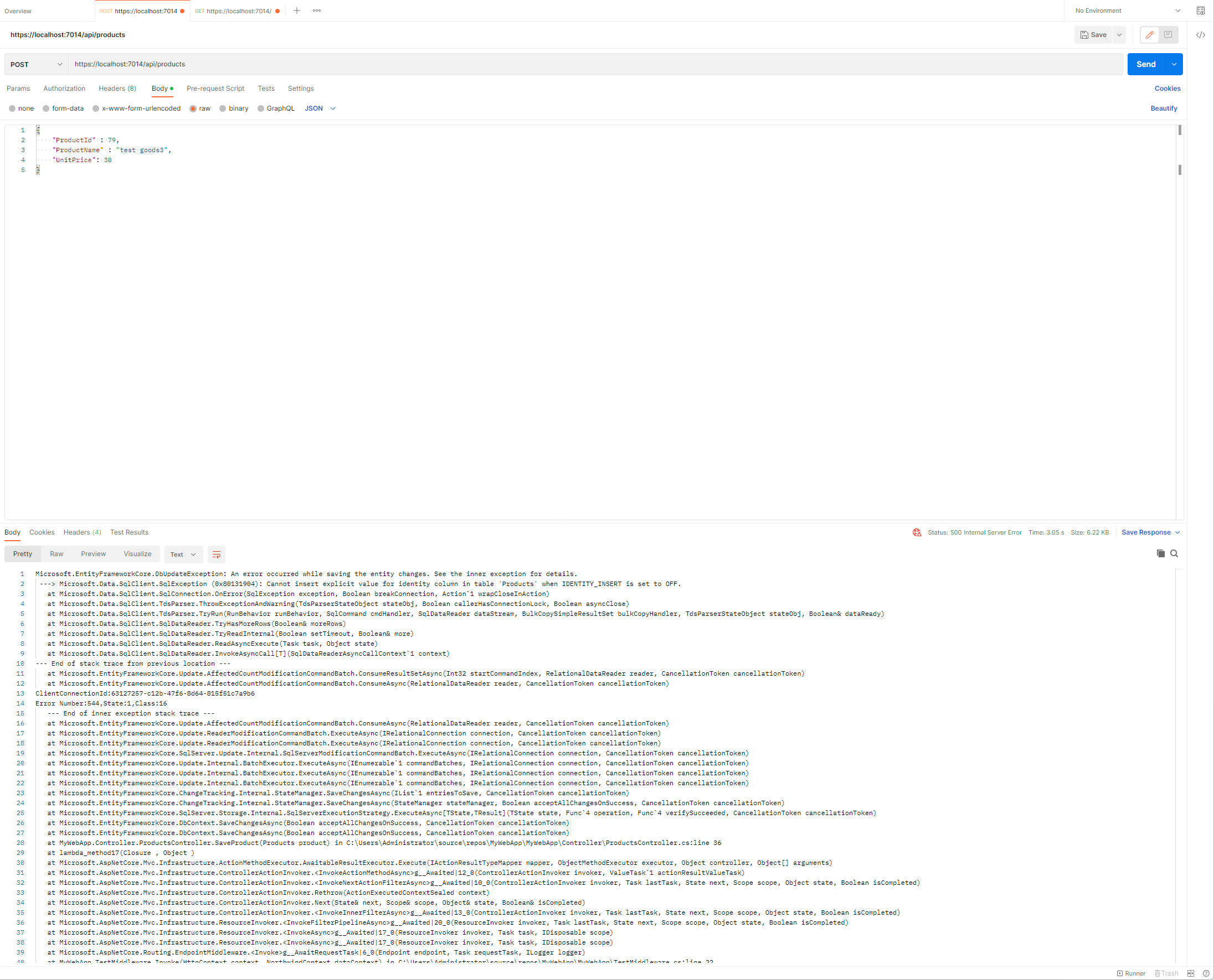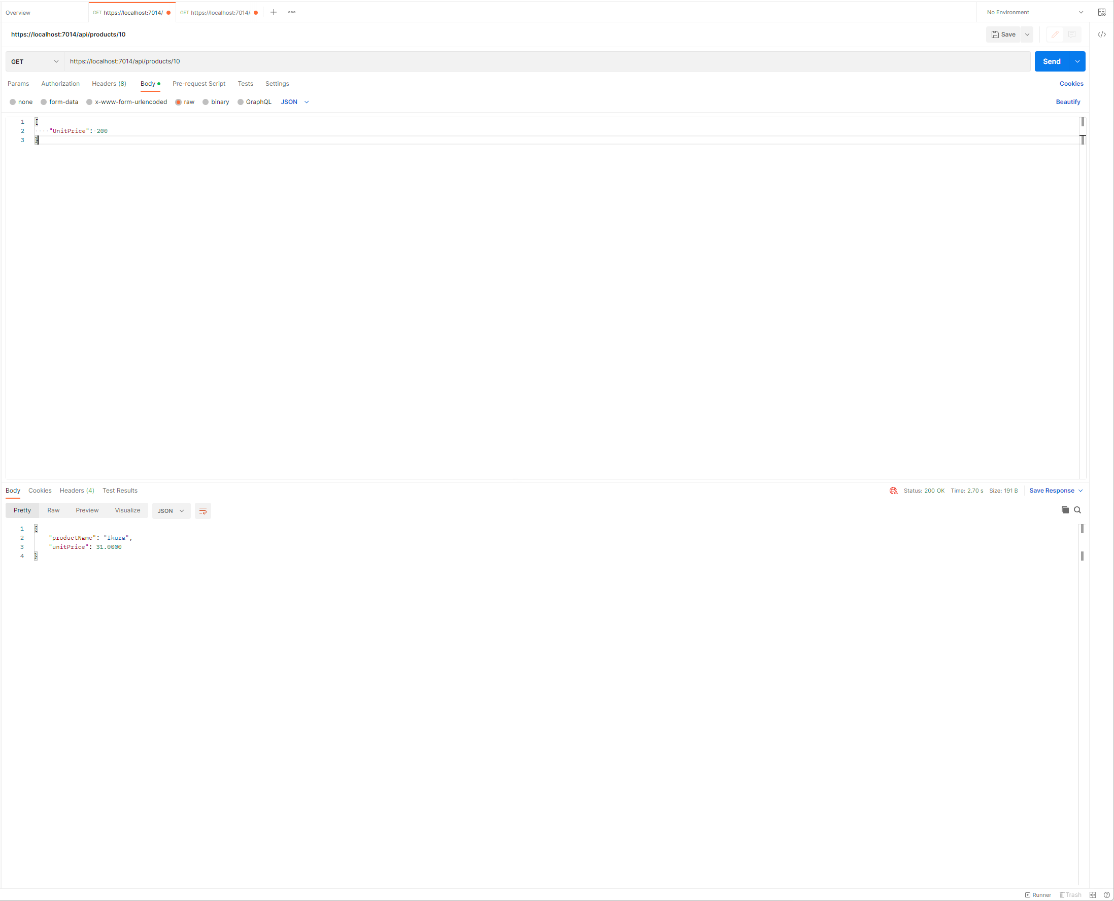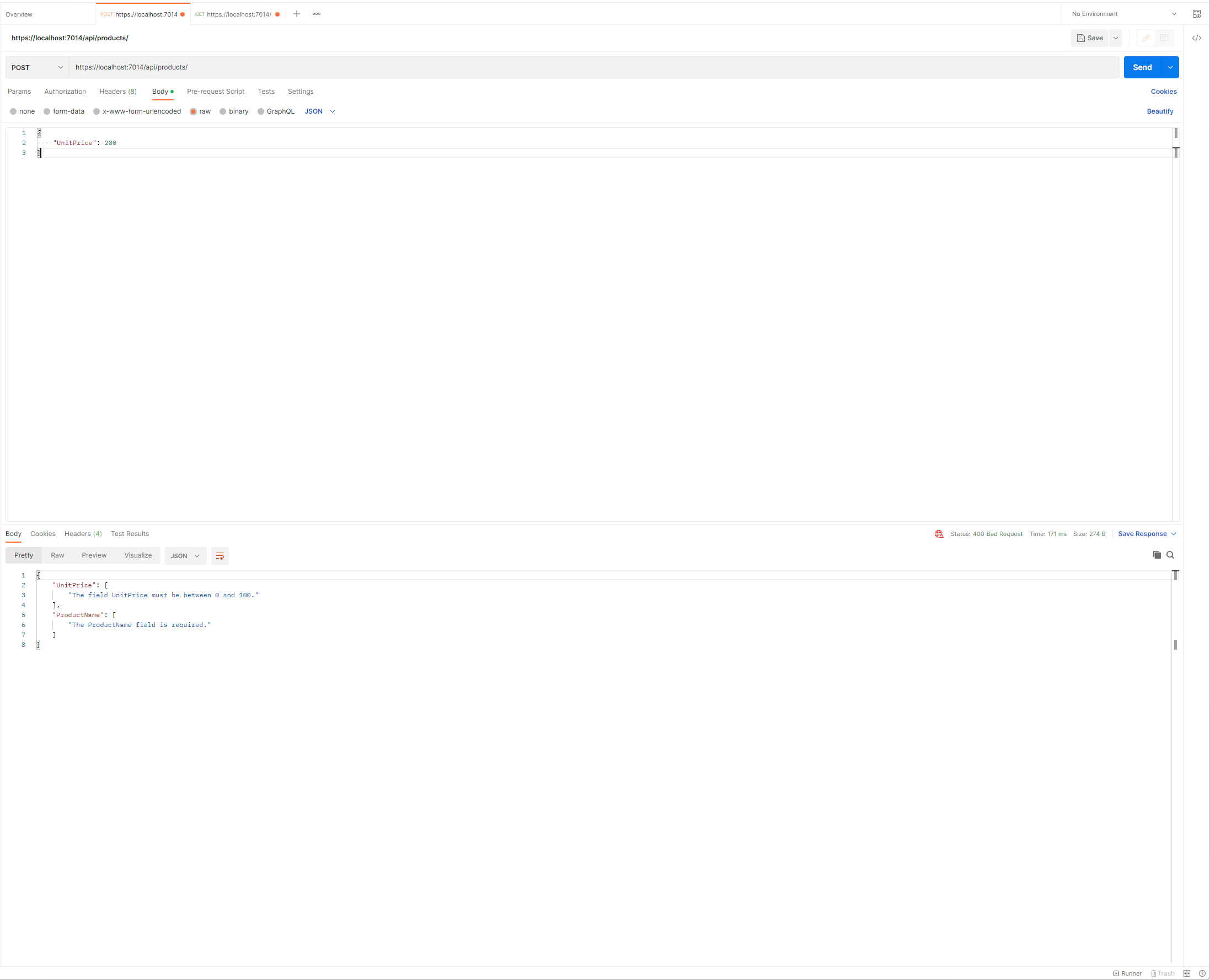 POST 요청에서는 요청의 Body가 JSON형식이며 Product 개체로 생성되고 Database에 추가되기 위해 Parsing이 이루어질 것입니다. 보내지는 JSON개체는 보시는 바와 같이 ProductName, UnitPrice, Price,