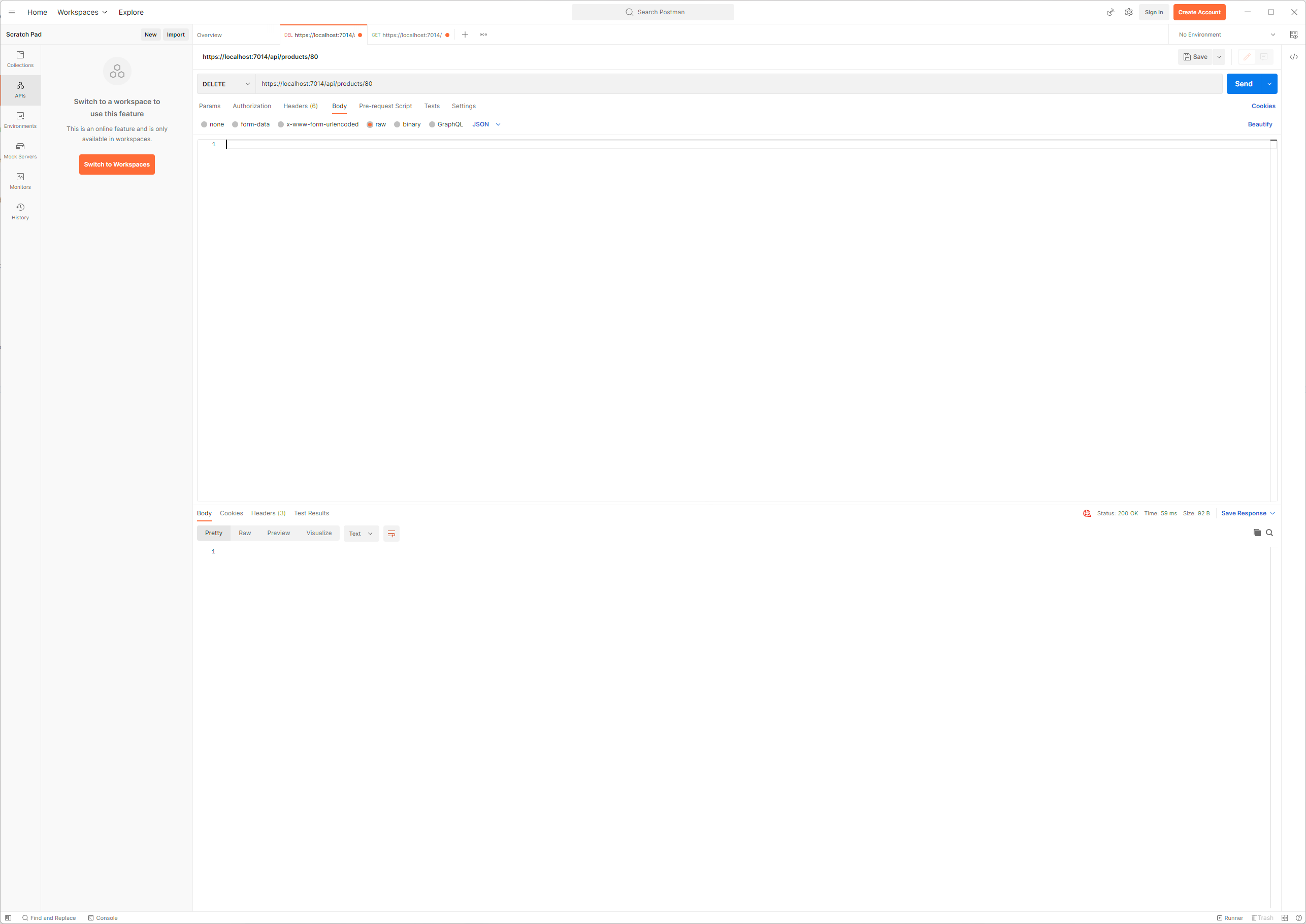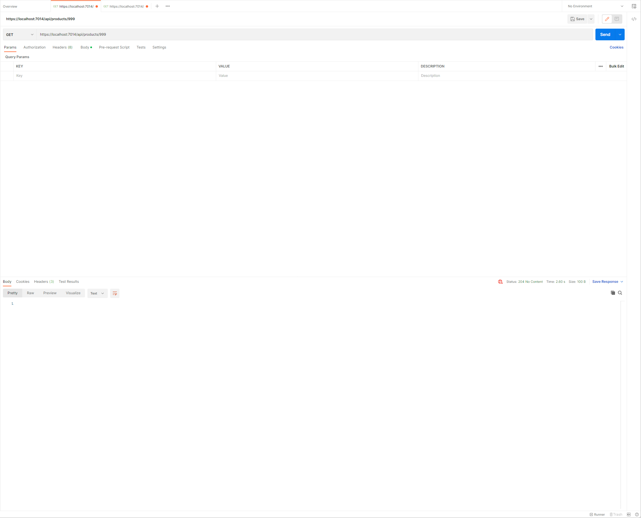 Project를 실행하여 postman을 통해 이전과 동일하게 GetProduct Method를 실행하게 되면 수정된 Code에 따라 404 Not Found 상태 코드가 반환될 것입니다.