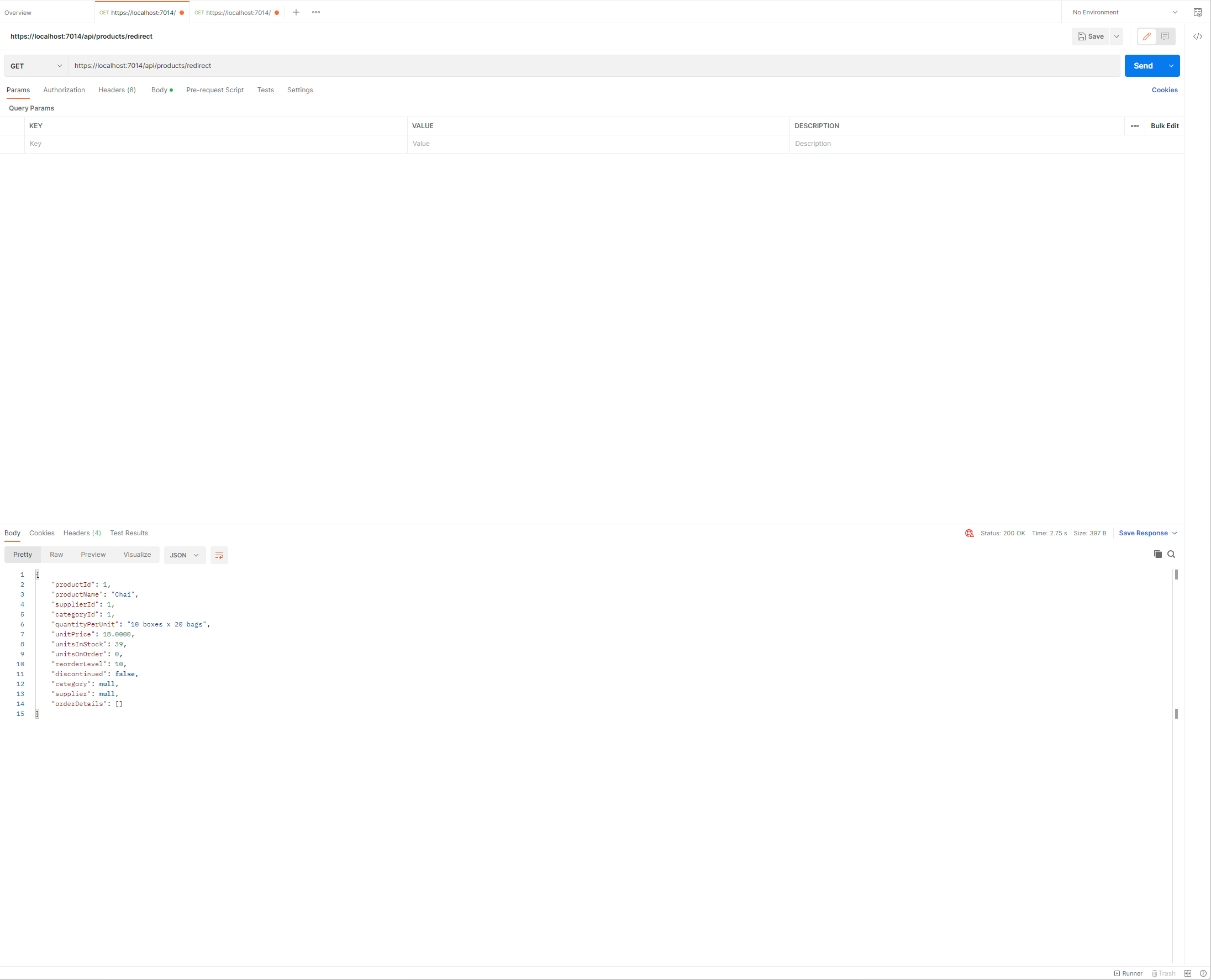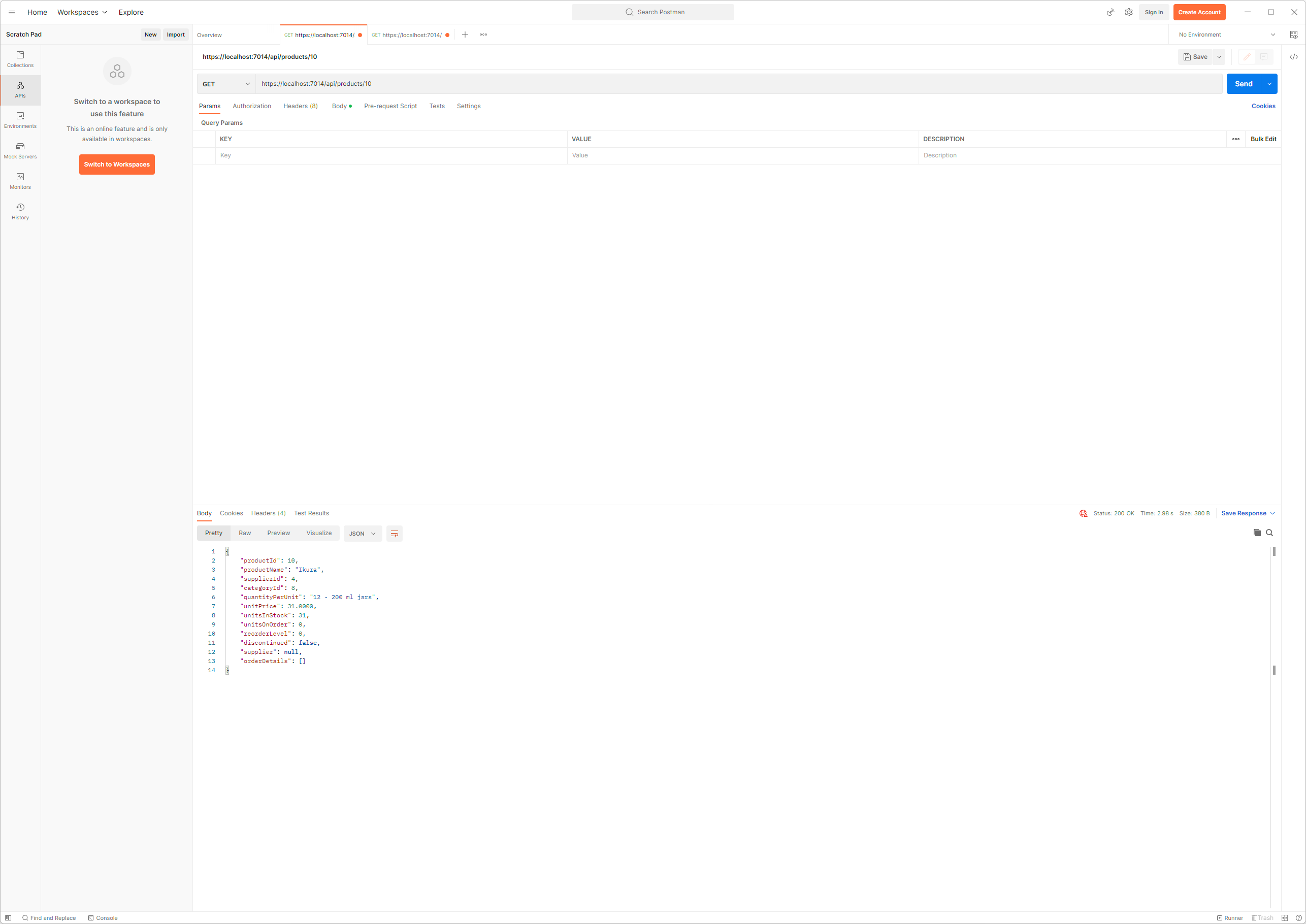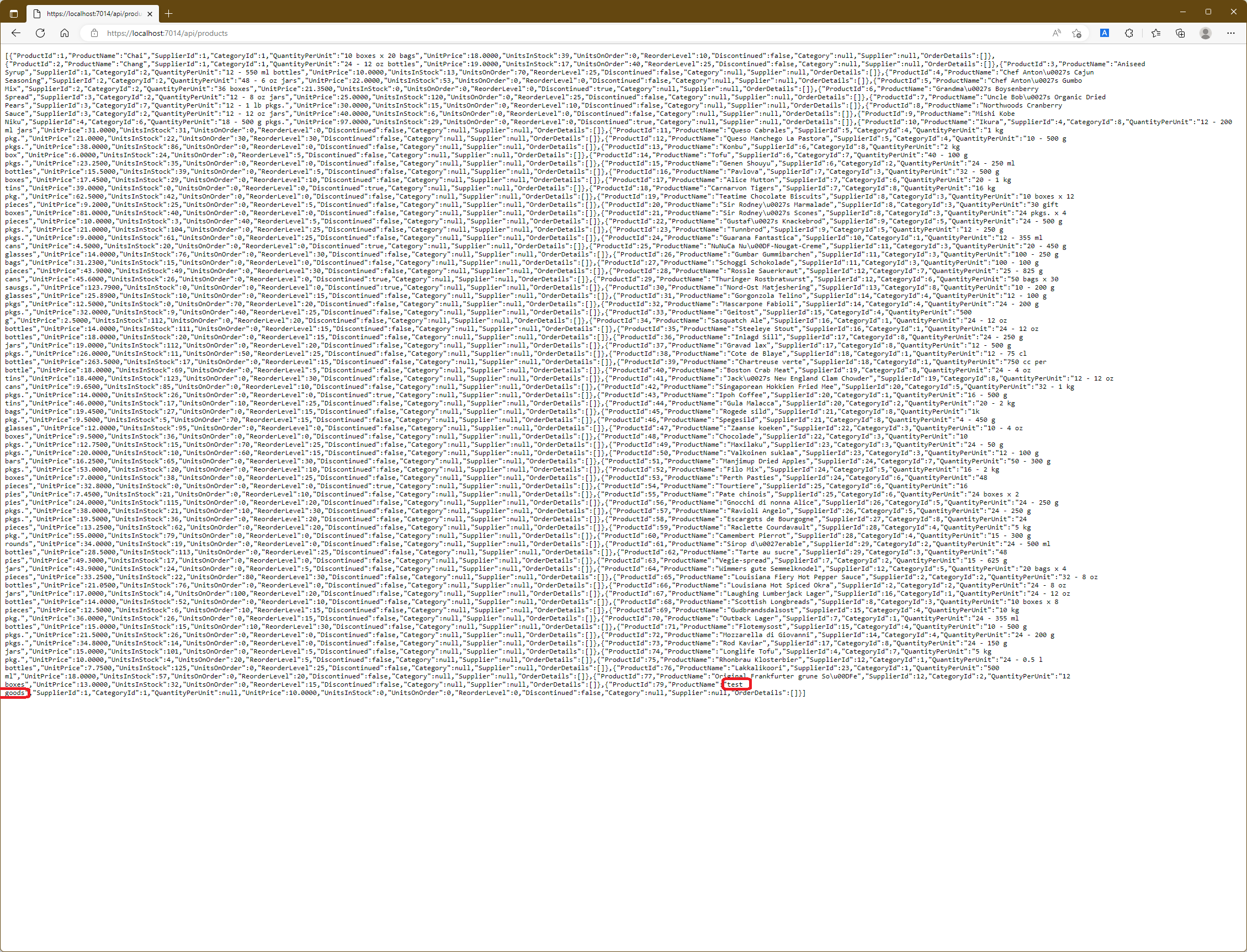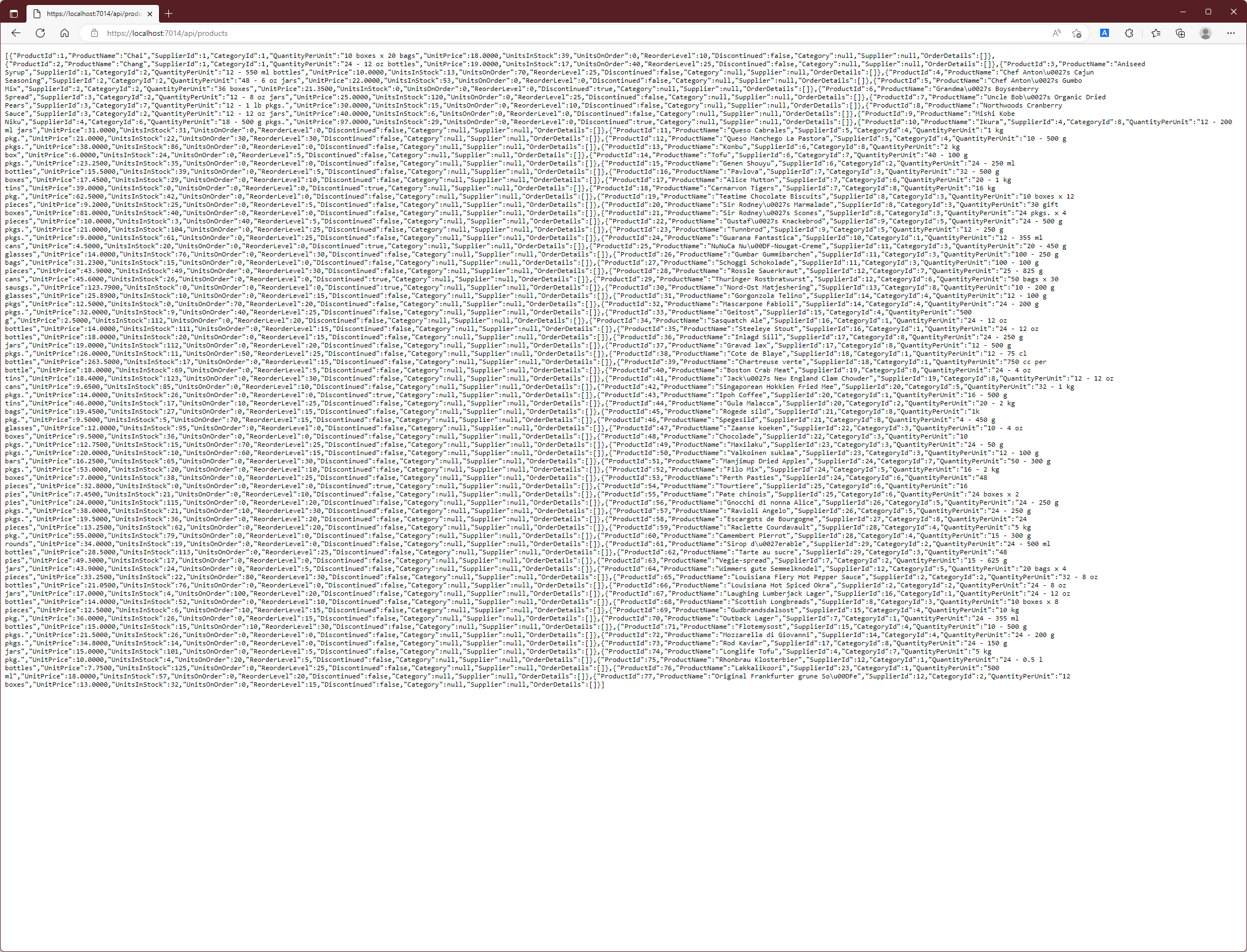 GET 요청이 보내지고 Web Service로 부터 위와 같은 응답이 표시될 것입니다. GetProduct action method에 의해 처리된 요청은 응답에서 category와 supplier가 null이 되었습니다. 이들 속성은 navigation속성으로서 복잡한 질의가 수행되는 경우 Entity Framework Core가 Data를 관련시키기 위해 사용됩니다. 하지만 예제와 같은 간단한 질의의 경우에는 어떠한 값도 이들 navation 속성에 할당되지 않는데 이로 인해 client는 사용할 수 없는 값을 가진 속성을 같이 받게 되는 것입니다.