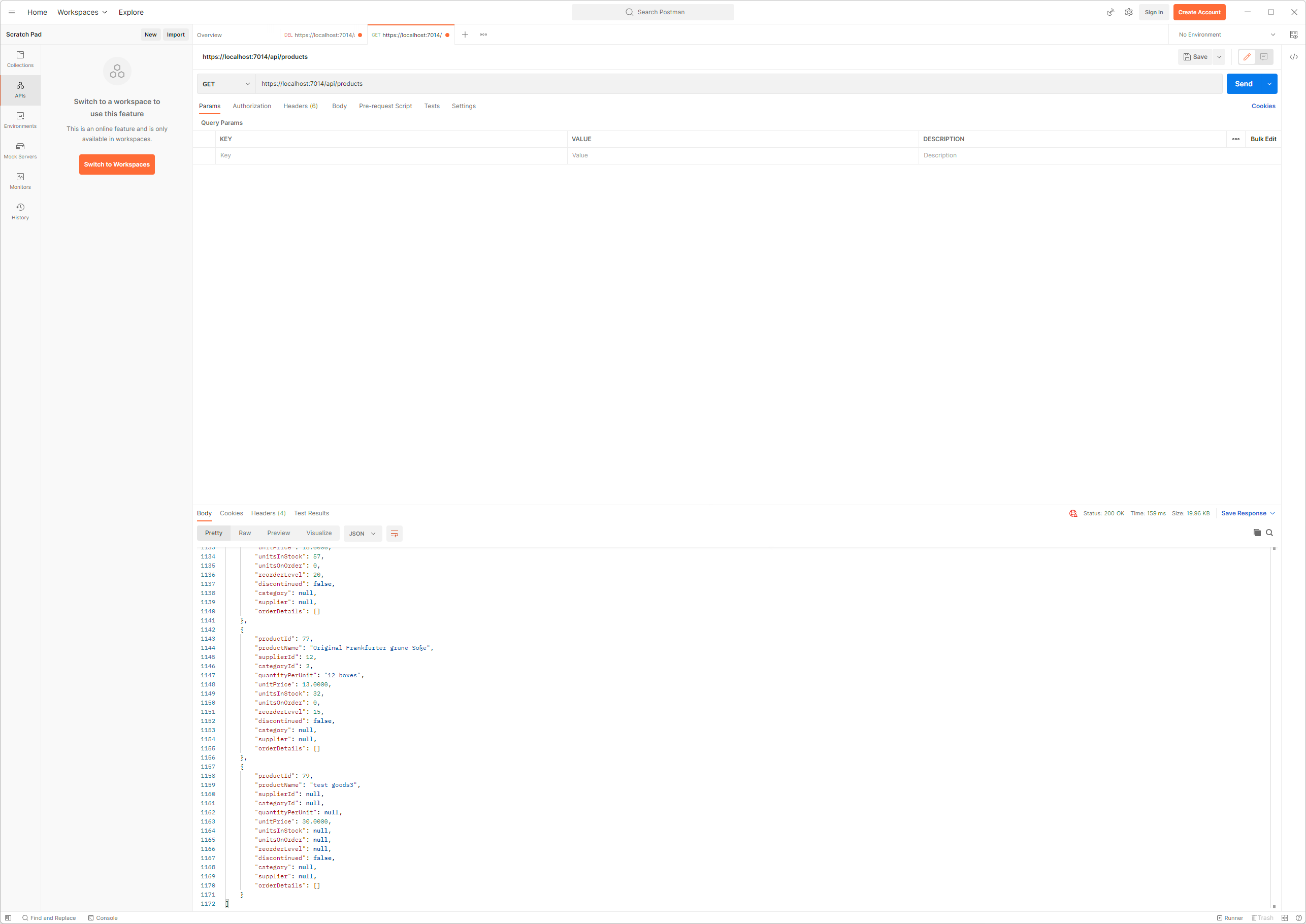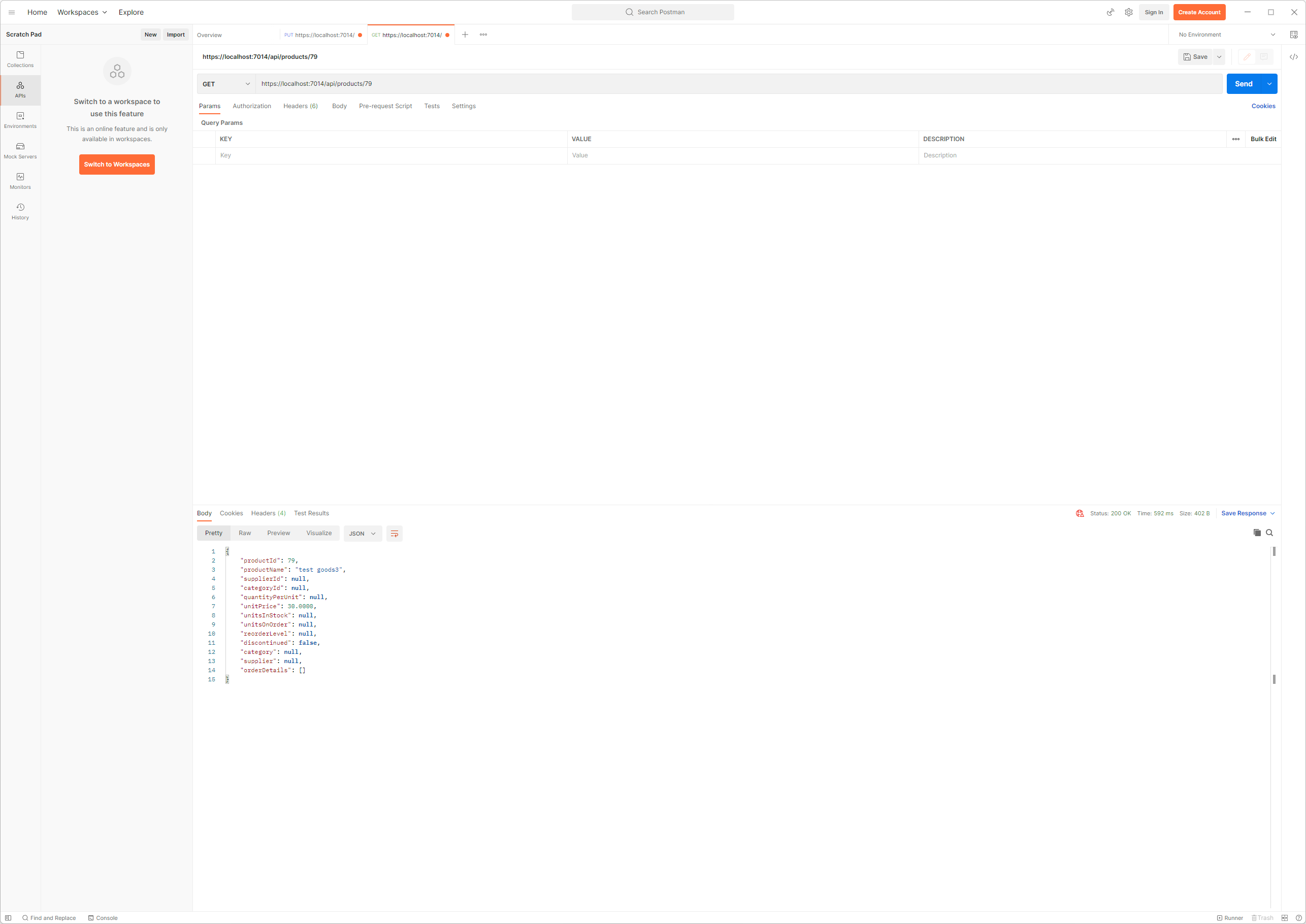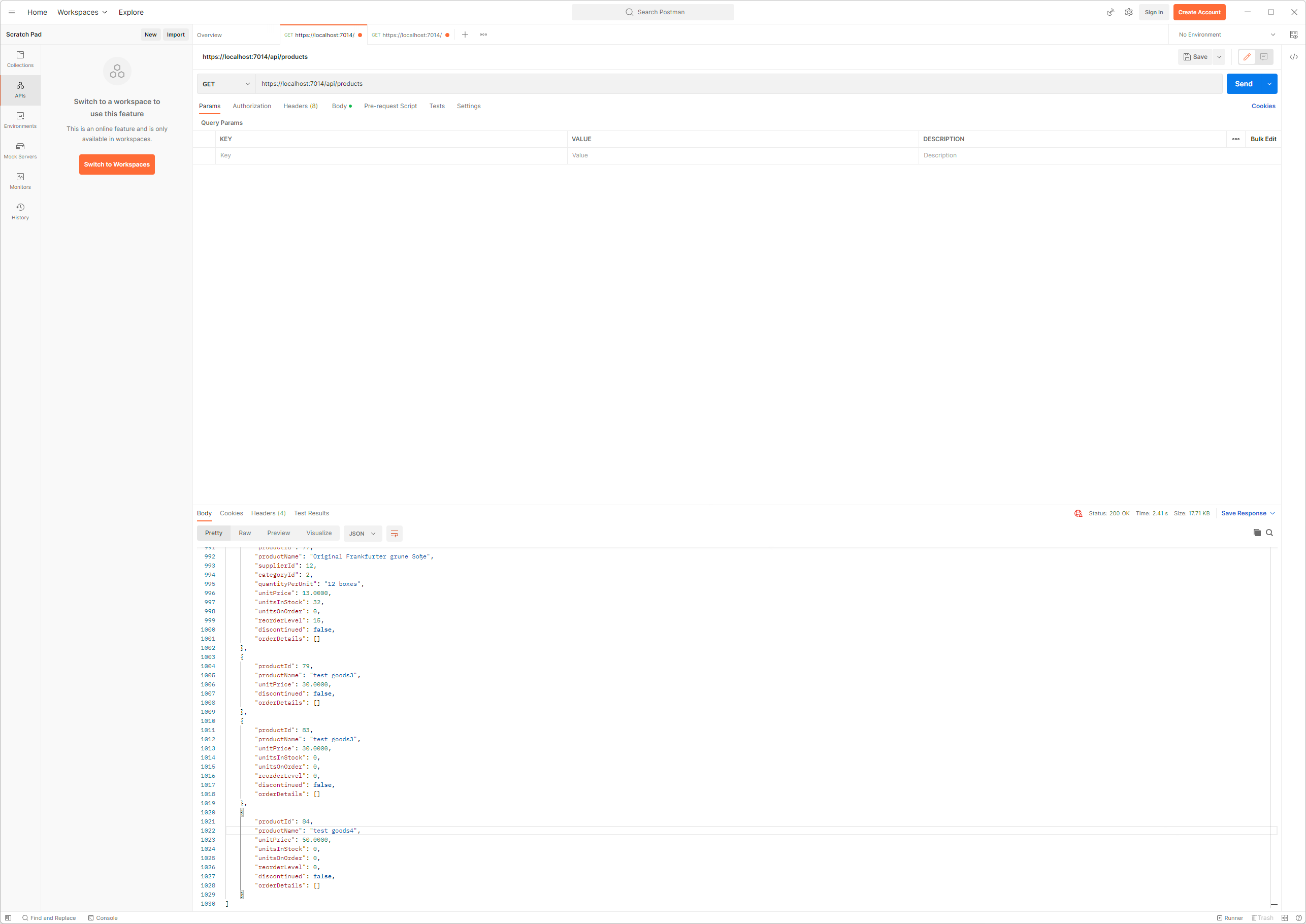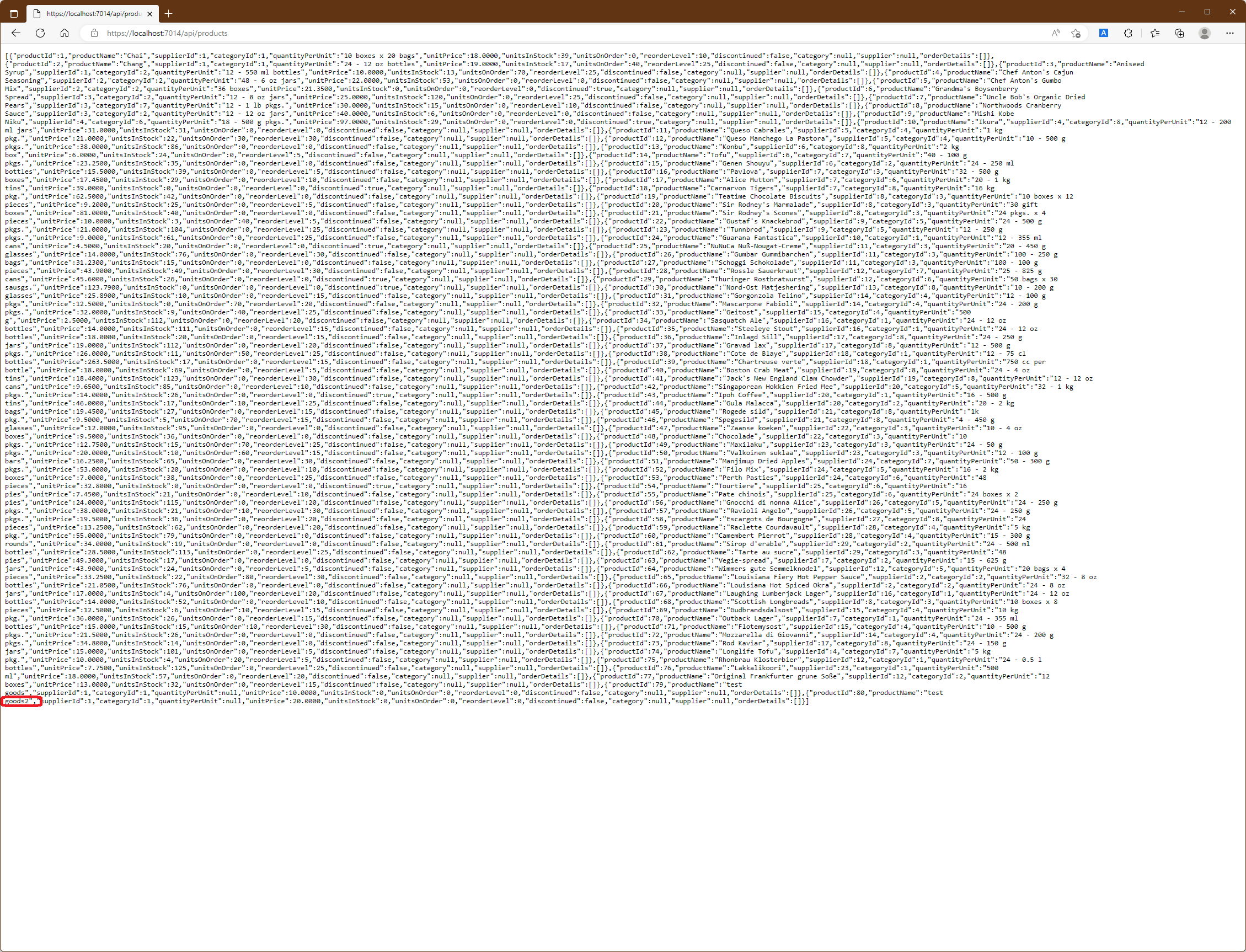 GET 요청이 보내지고 Web Service로 부터 위와 같은 응답이 표시될 것입니다. GetProduct action method에 의해 처리된 요청은 응답에서 category와 supplier가 null이 되었습니다. 이들 속성은 navigation속성으로서 복잡한 질의가 수행되는 경우 Entity Framework Core가 Data를 관련시키기 위해 사용됩니다. 하지만 예제와 같은 간단한 질의의 경우에는 어떠한 값도 이들 navation 속성에 할당되지 않는데 이로 인해 client는 사용할 수 없는 값을 가진 속성을 같이 받게 되는 것입니다.