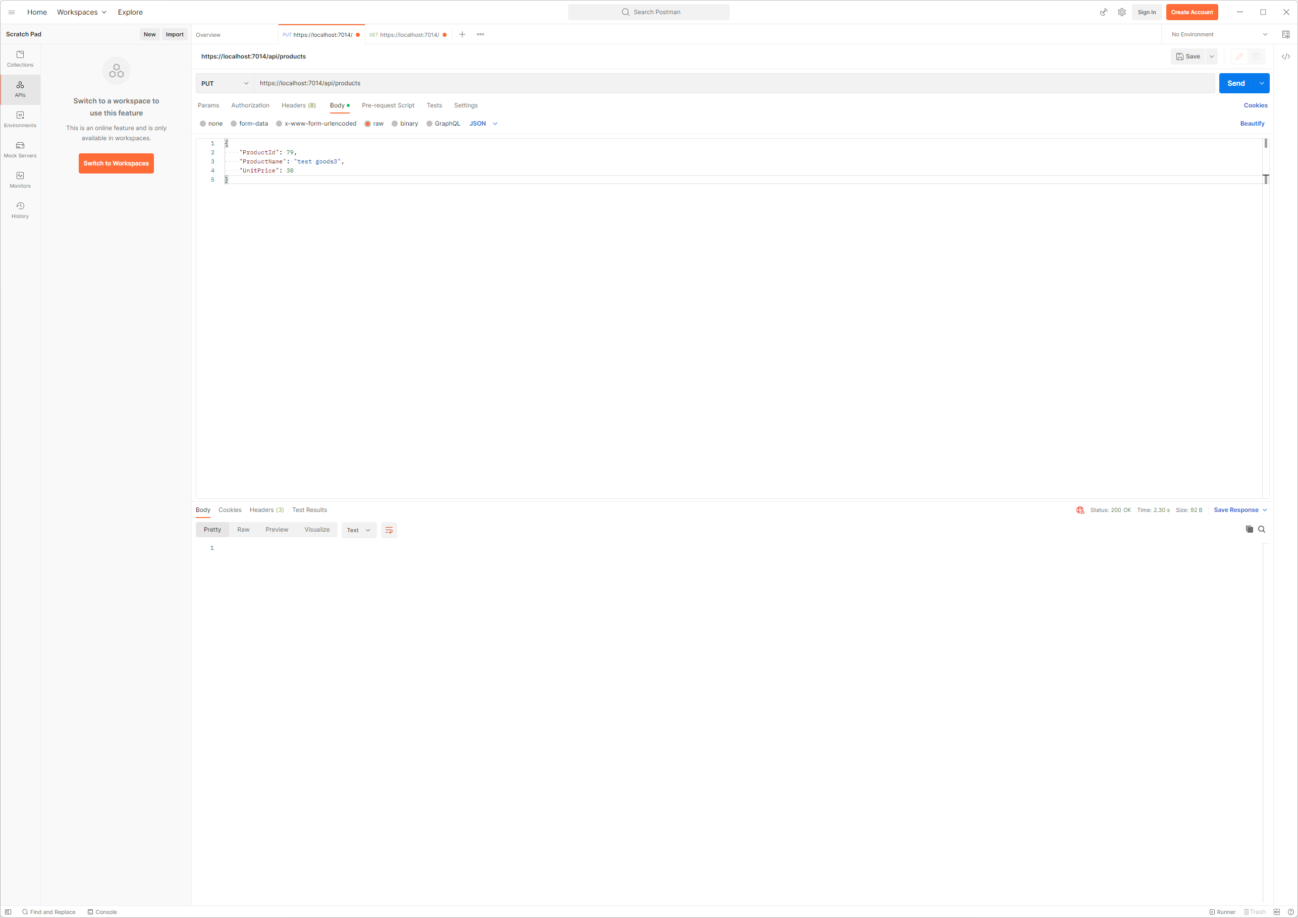 Postman을 실행시켜 아래와 같이 'POST'를 선택하고 주소에 'https://localhost:7014/api/products'처럼 Web Service가 동작하는 URL을 설정합니다. 그리고 Body에 raw를 선택하고 'JSON'으로 설정을 맞춘 후 다음과 같이 Product의 객체를 JSON형식으로 전달합니다.