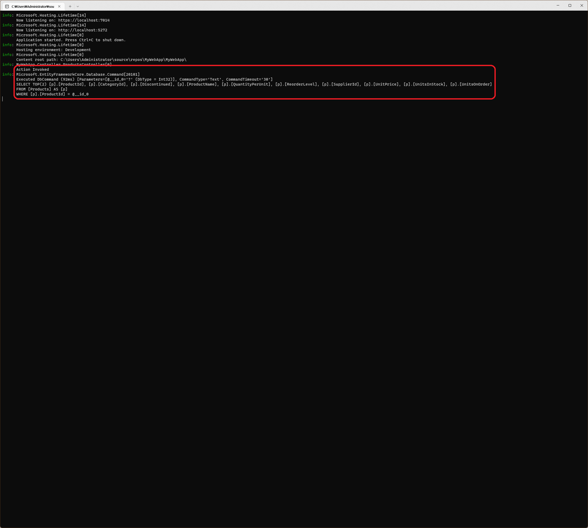 AddControllers method는 MVC Framework에서 필요한 Service를 정의하며 MapControllers method는 Controller가 요청을 처리할 수 있도록 하는 route를 정의합니다. MVC framework를 위한 다른 기능의 Method들도 존재하지만 일단 예제에서는 Web Service를 위한 MVC Framework를 설정하는 Method만이 사용되었습니다.