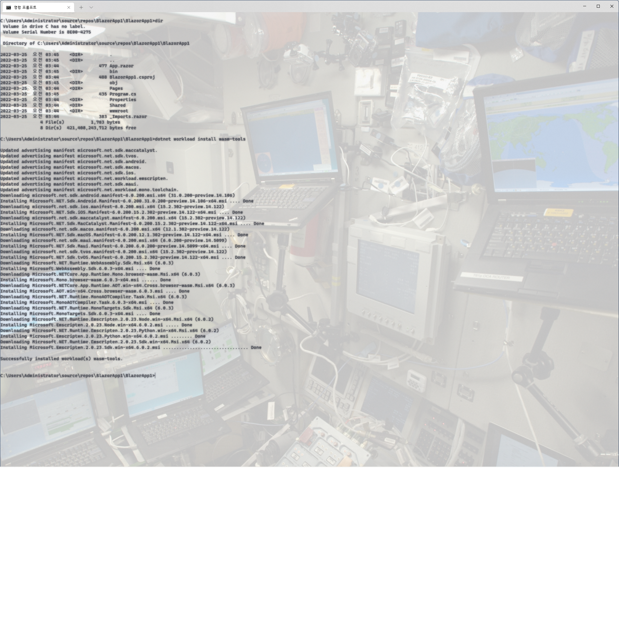 AOT사용을 위해서는 우선 아래명령을 통해 '.NET WebAssembly build tools'를 내려받고 설치해야 합니다.