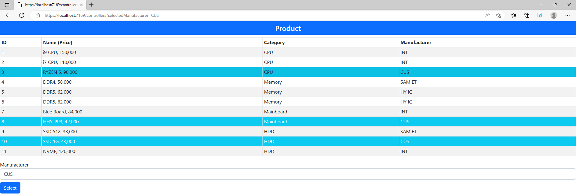 project를 실행하고 /controllers와 /pages에 URL을 요청합니다. 그리고 화면에 있는 select 요소를 통해 Manufacturer를 선택하고 Select button을 눌러 table에서 선택한 Manufacturer의 Row가 강조되어 표현되는지 확인합니다.