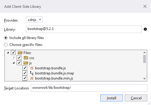 예제 application에서 생성된 HTML 요소의 style을 위해 Bootstrap CSS framework를 사용하고자 합니다. Bootstrap package를 설치하기 위해 project folder에서 Mouse오른쪽 button을 누르고 Add -> Client-Side Library를 선택합니다. 해당 화면에서는 다음과 같이 설정하고