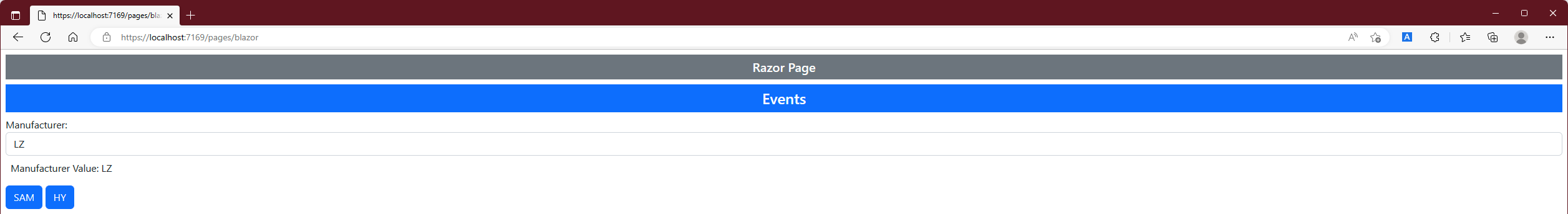 예제에서의 attribute결합은 oninput event(input요소가 focus를 잃을 때보다는 모든 key 눌림후에 발생되는)가 trigger될때 update되는 Manufacturer속성을 위한 binding을 생성합니다. project를 실행하고 /pages/blazor로 URL을 요청한 뒤 input요소에 입력을 시도합니다. 그러면 Manufacturer속성이 key눌림 후 update 될 것입니다.