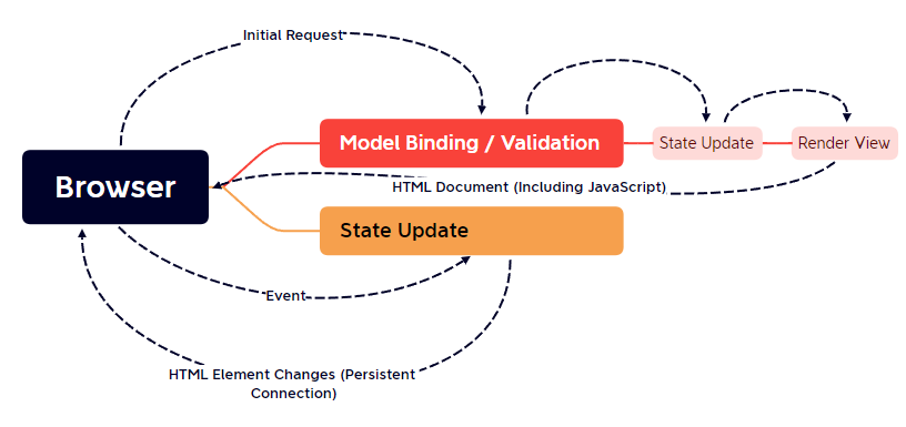 하지만 Blazor는 다른 접근법을 취하고 있습니다. Javascript library가 browser로 전송되는 HTML문서안에 포함되고 Javascript code가 실행될 때 server로의 HTTP연결을 다시 열어두어 사용자의 상호작용을 준비하게 됩니다. 예를 들어 사용자가 select요소에서 값을 선택하게 되면 선택한 세부사항이 server로 전송되고 기존 HTML에 적용할 변경사항만을 응답받는 것입니다.