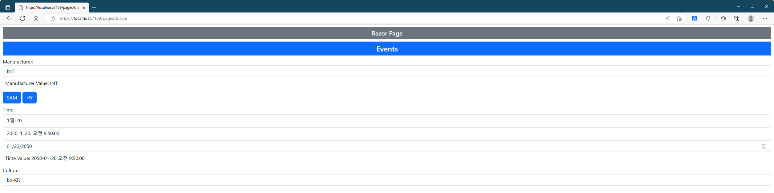 예제에서 3번째 input요소에 표시된 값은 선택한 문화권과는 관계없이 바뀌지 않습니다. 해당 input요소는 상기 표에 명시된 attribute를 가지고 있지 않지만 date를 설정하는 type attribute는 가지고 있습니다. type을 date나 datetime-local, month 또는 time로 설정하는 경우에는 특정 문화권이나 형식문자열을 지정할 수 없습니다. 왜냐하면 Blazor는 자동으로 형식 date값을 browser가 사용자의 locale로 변환하는 culture-neutral형식을 사용하기 때문입니다. 위 응답화면에서 date는 en-US locale로 형식화된 결과를 보여주고 있지만 실제 사용자는 자신들의 지역화에 맞게 변환된 date를 보게 될 것입니다.