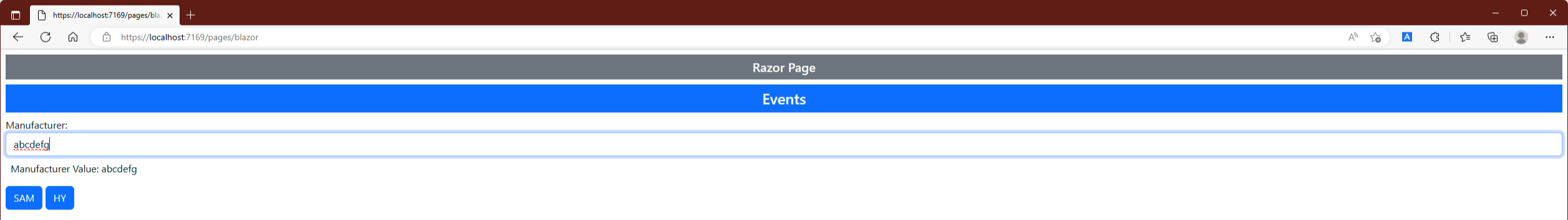 예제에서의 attribute결합은 oninput event(input요소가 focus를 잃을 때보다는 모든 key 눌림후에 발생되는)가 trigger될때 update되는 Manufacturer속성을 위한 binding을 생성합니다. project를 실행하고 /pages/blazor로 URL을 요청한 뒤 input요소에 입력을 시도합니다. 그러면 Manufacturer속성이 key눌림 후 update 될 것입니다.