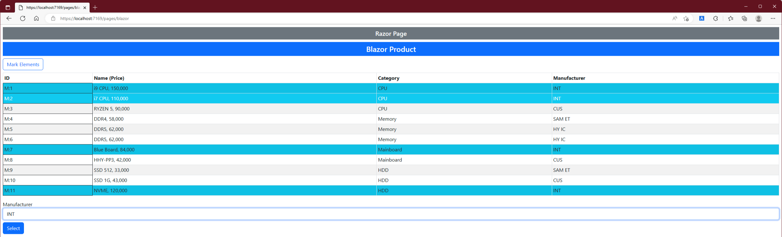 input요소의 value attribute는 다른 방향으로 관계를 형성하므로 Manufacturer속성의 값의 바뀔 때 요소의 값도 바뀌면서 사용자에게 표시된 text도 같이 바뀌게 됩니다. 위 예제의 Razor Component를 적용하기 위해 Pages folder의 Blazor.cshtml file에서 Razor Page component attribute를 아래와 같이 변경합니다.