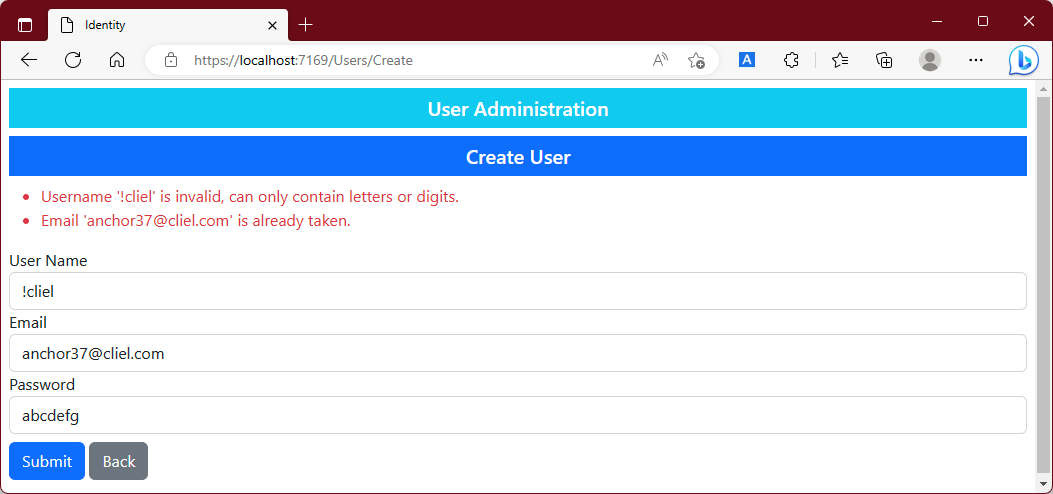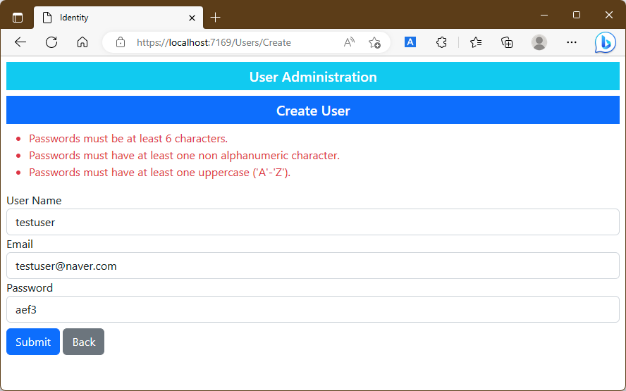 ASP.NET Core Identity는 role의 할당을 변경할 때 사용자의 상세에 대한 유효성검증을 다시 수행하기 때문에 사용자 정보를 현재의 제약사항과 일치하지 않게 변경하려는 경우 오류를 발생시키게 됩니다. 이는 application이 배포된 이후 제약사항이 도입되고 database가 이미 이전 role에서 만들어진 경우 발생합니다. 이 때문에 위 예제에서 Razor Page는 role에서 사용자를 추가하거나 삭제하는 동작의 결과를 확인하여 유효성검증 message를 오류로서 표시하고 있습니다.