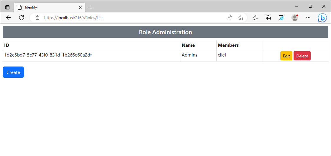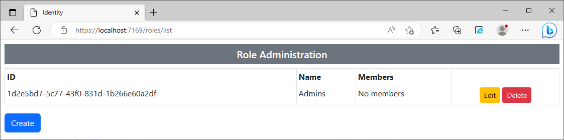 예제에서는 새로운 role의 이름을 지정하기 위한 input요소를 가진 form을 제공하고 있습니다. form이 submit 되면 OnPostAsync method는 새로운 IdentityRole개체를 생성하게 되고 이를 CreateAsync method로 전달하게 됩니다.