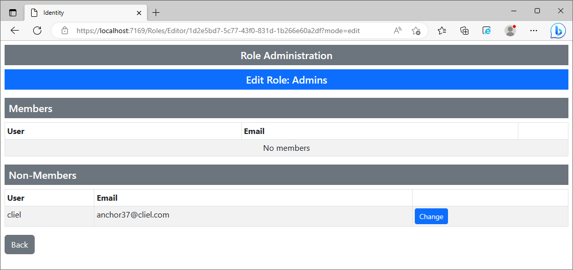 예제에서 사용자에게는 누가 해당 role의 member인지를 보여주는 table과 member가 아닌 사용자를 나타내는 table을 제공하고 있습니다. 또한 각 행에는 form을 submit 하는 Change button을 포함하고 있습니다. OnPostAsync method는 database로부터 사용자를 가져오기 위해 UserManager.FindByIdAsync method를 사용하고 있습니다. IsInRoleAsync method는 사용자가 role의 member인지 아닌지를 확인하는 데 사용되며 AddToRoleAsync와 RemoveFromRoleAsync method는 각각 사용자를 추가하거나 삭제하는 데 사용됩니다.