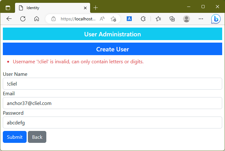 ASP.NET Core Identity는 role의 할당을 변경할 때 사용자의 상세에 대한 유효성검증을 다시 수행하기 때문에 사용자 정보를 현재의 제약사항과 일치하지 않게 변경하려는 경우 오류를 발생시키게 됩니다. 이는 application이 배포된 이후 제약사항이 도입되고 database가 이미 이전 role에서 만들어진 경우 발생합니다. 이 때문에 위 예제에서 Razor Page는 role에서 사용자를 추가하거나 삭제하는 동작의 결과를 확인하여 유효성검증 message를 오류로서 표시하고 있습니다.