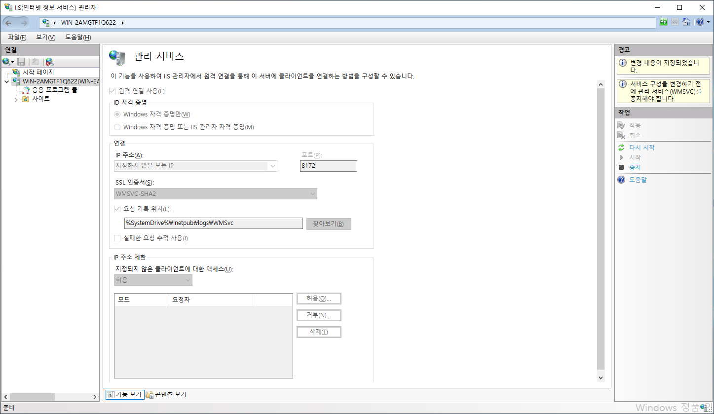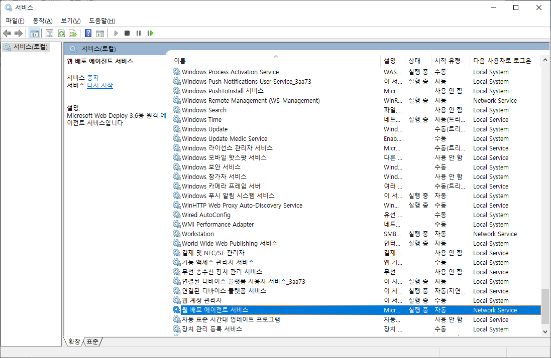 여기까지 완료하고 나서 Server의 Serivces를 확인해 'Web Management Service'와 'Web Deployment Service(웹 배포 서비스)'가 실행중인지를 확인합니다. 해당 service는 모두 실행중이여야 합니다.
