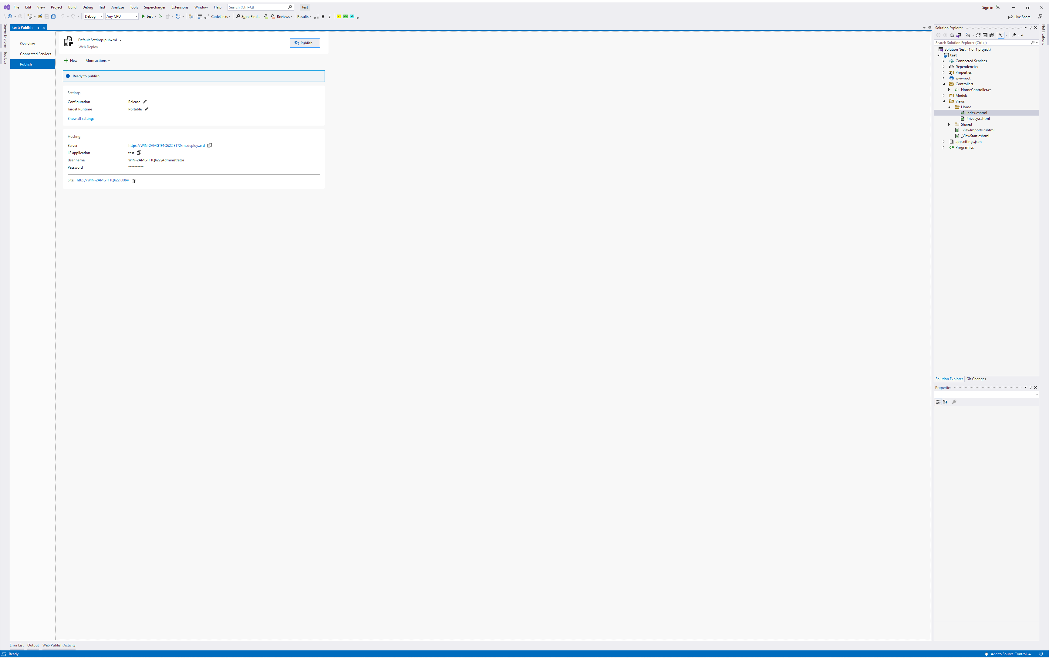 필요에 따라 상세 배포설정을 진행한 뒤 배포를 시도하면 해당 계정의 비밀번호를 묻는 화면이 나오게 되고 비밀번호를 입력하면 IIS로 곧장 배포가 진행될 것입니다.