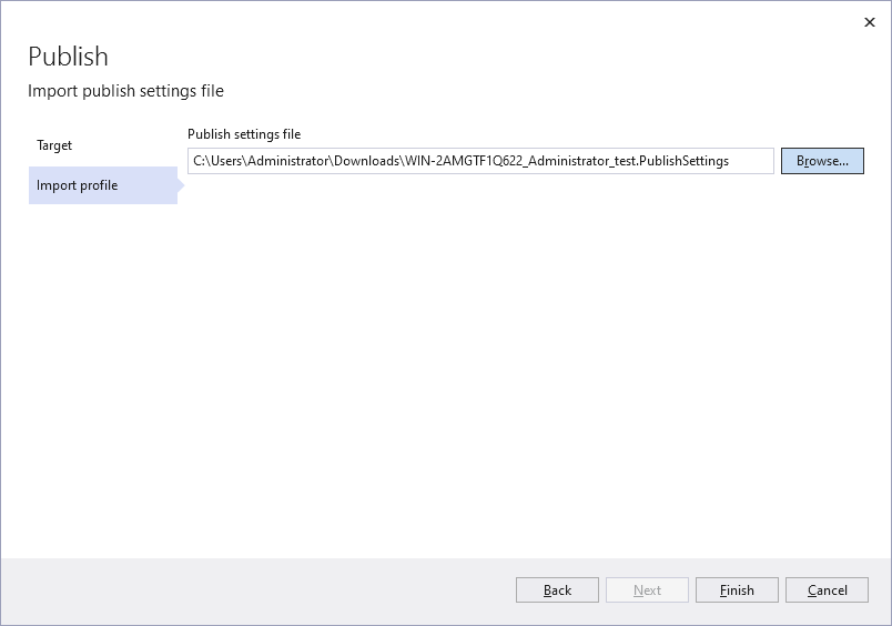 Visual Studio에서 project의 배포를 설정해야 하는데 이때 'Import Profile'로 선택하여 진행합니다.